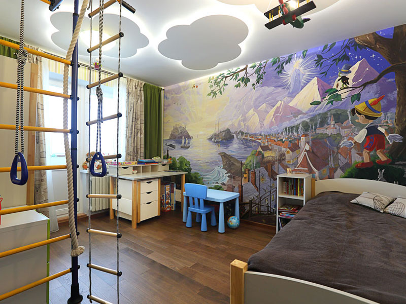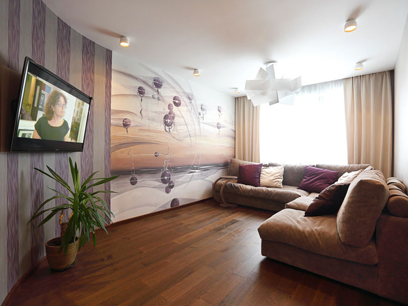 However, the styling of walls in different techniques became the main touch of the visual expansion. The anteroom welcomes us with the views of Paris streets. The living room is adorned with futuristic murals, and the nursery has the fairytale painting. Snow-white 3D panel was made just for the kitchen. The chosen decision widens the perspective and creates the appealing effect of the window into the parallel world. To incorporate the interior, every room uses the similar range of colors where brown and purple shades serve as a base for everything. Coswick hardwood flooring strengthens the visual uniformity of the apartment.