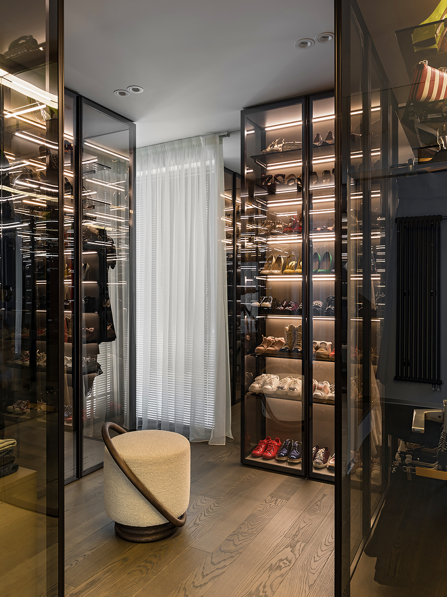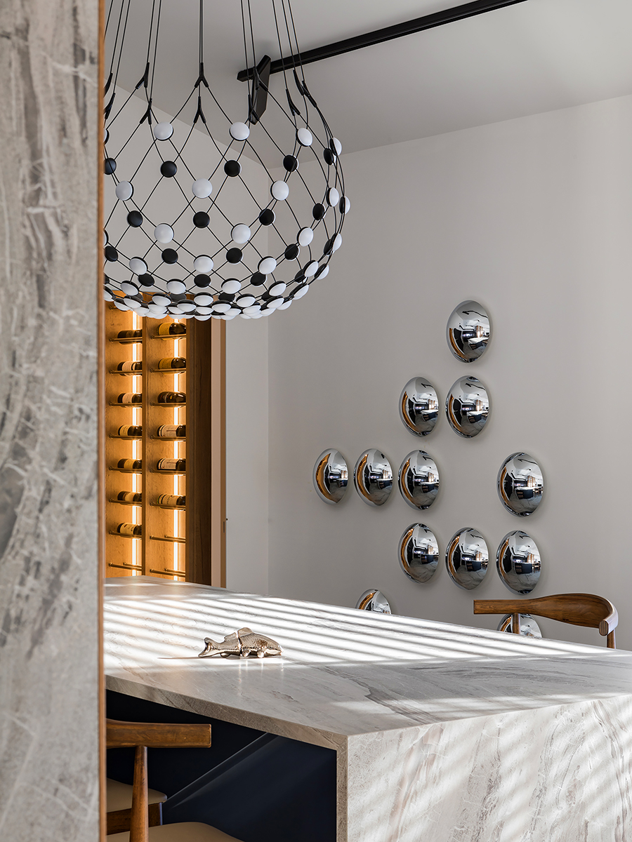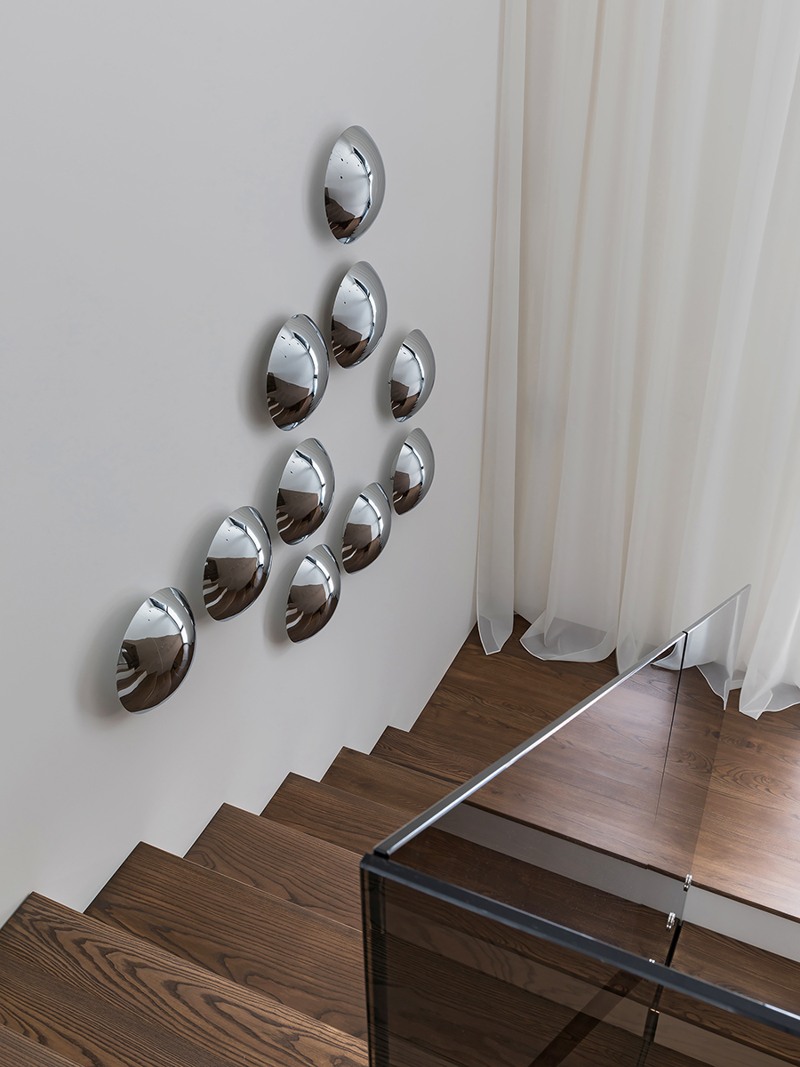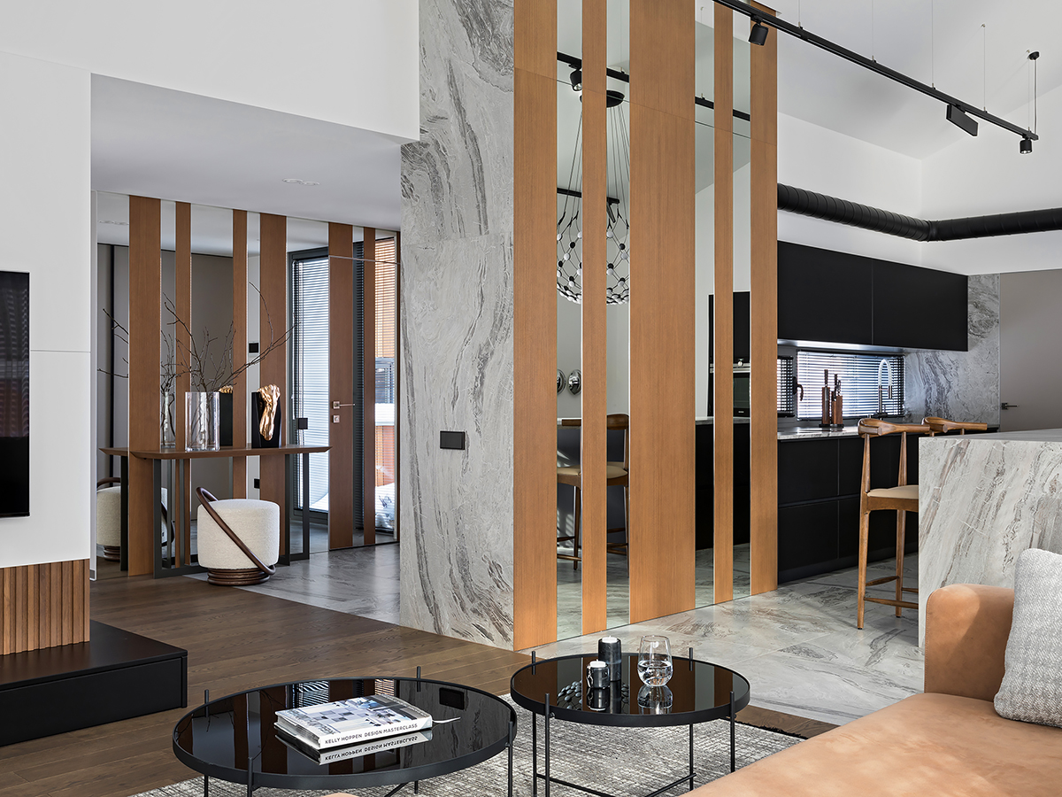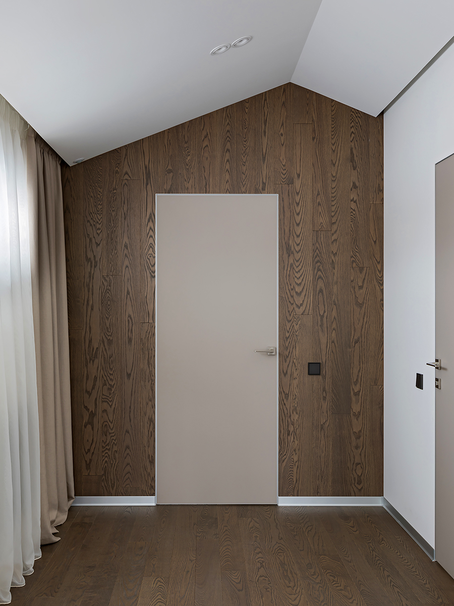 Natural variation of warm and cold shades, the contrast of natural wood and stone textures, metal and glass statements helped to create a serene quiet island, where owners can relax. Coswick Ash hardwood on the floor and on the walls fill the space with sun warmth.