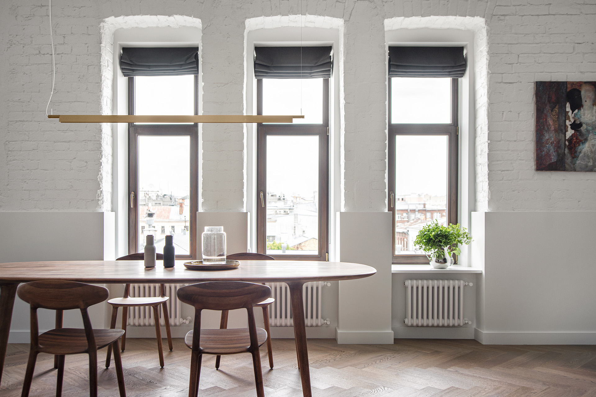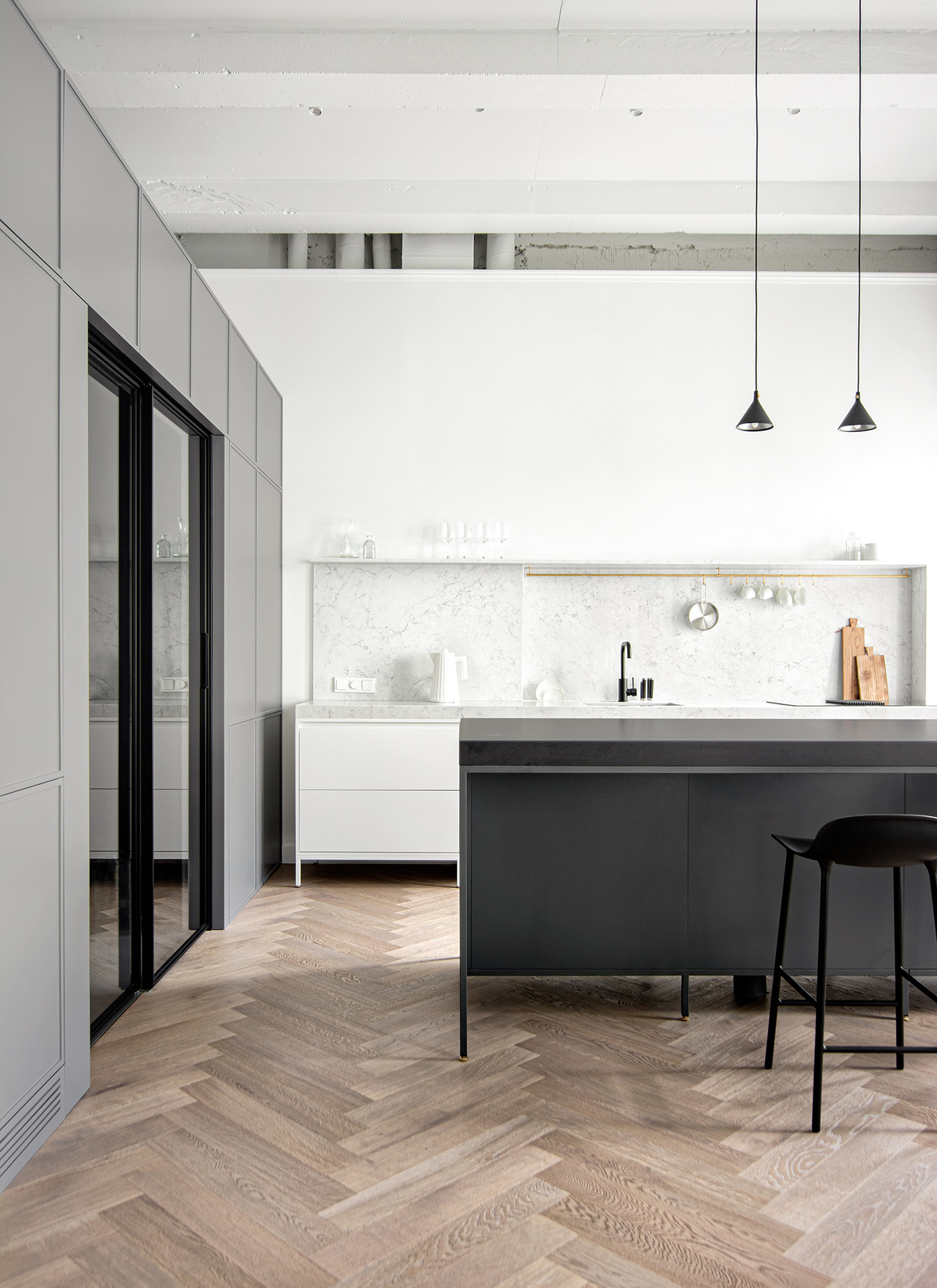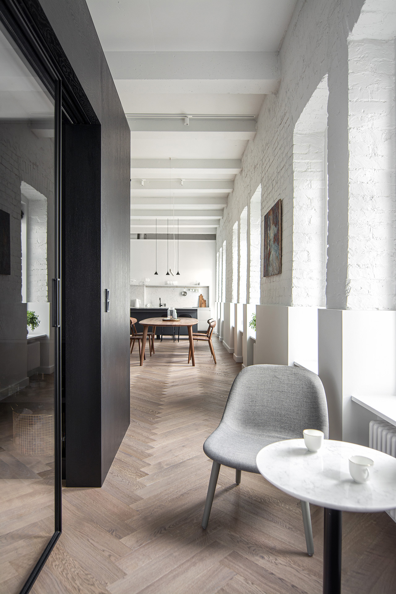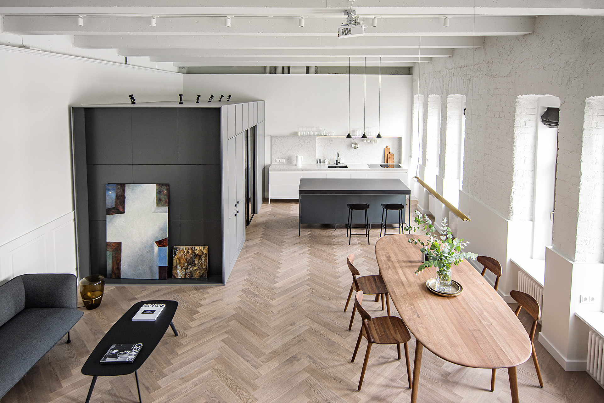 Classic white walls and dark minimalistic furniture contrast is relaxed by warm straw-colored Oak flooring matching the natural wood furniture elements. The classic flooring herringbone pattern underlines the authenticity of brick cladding and concrete ceiling with beams, as well as blends them into the modern interior of this historical building.
