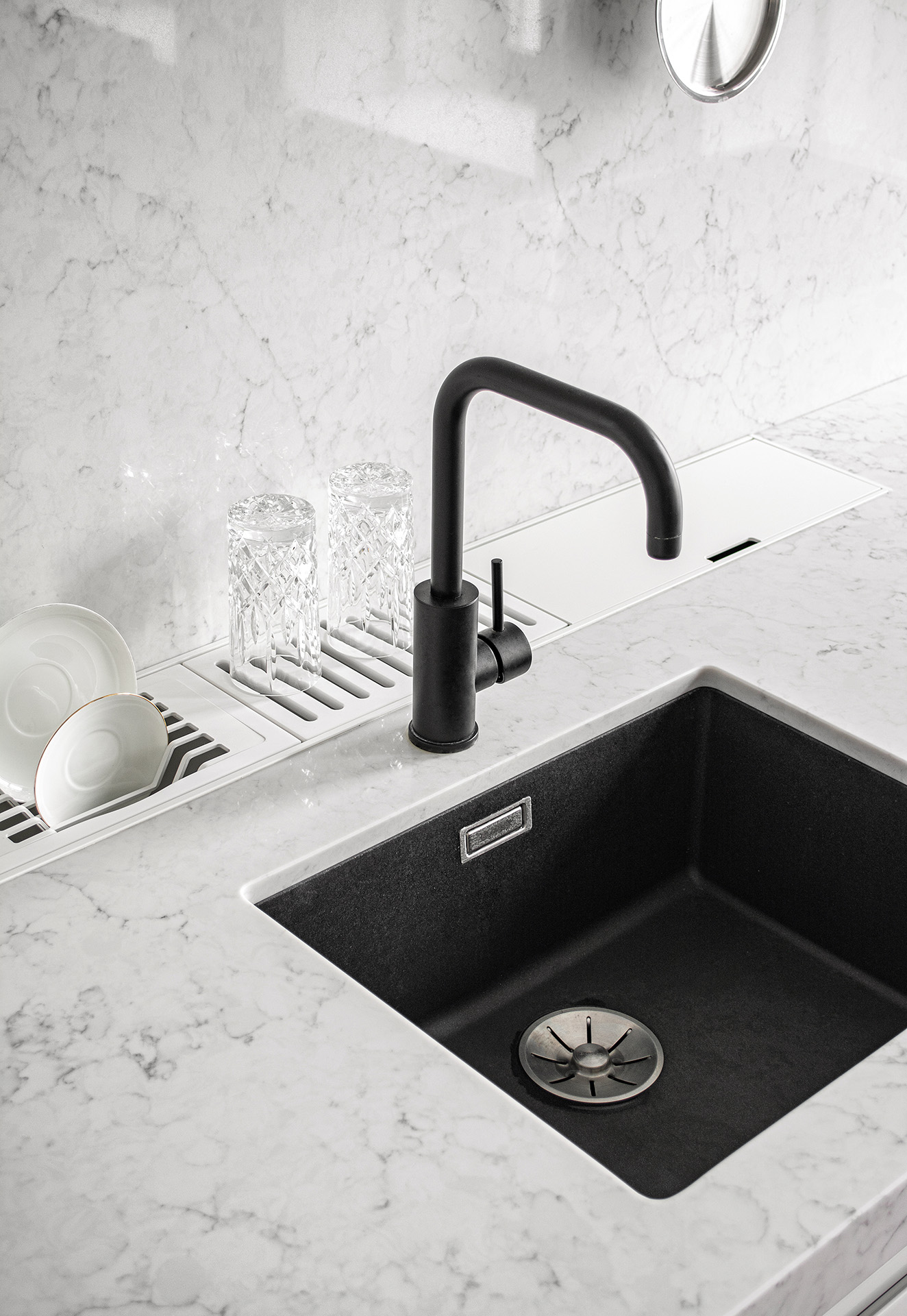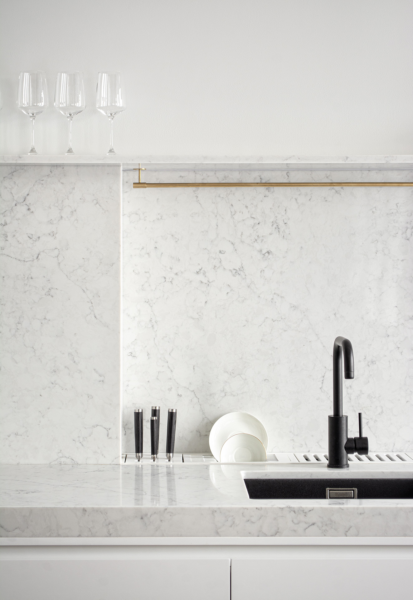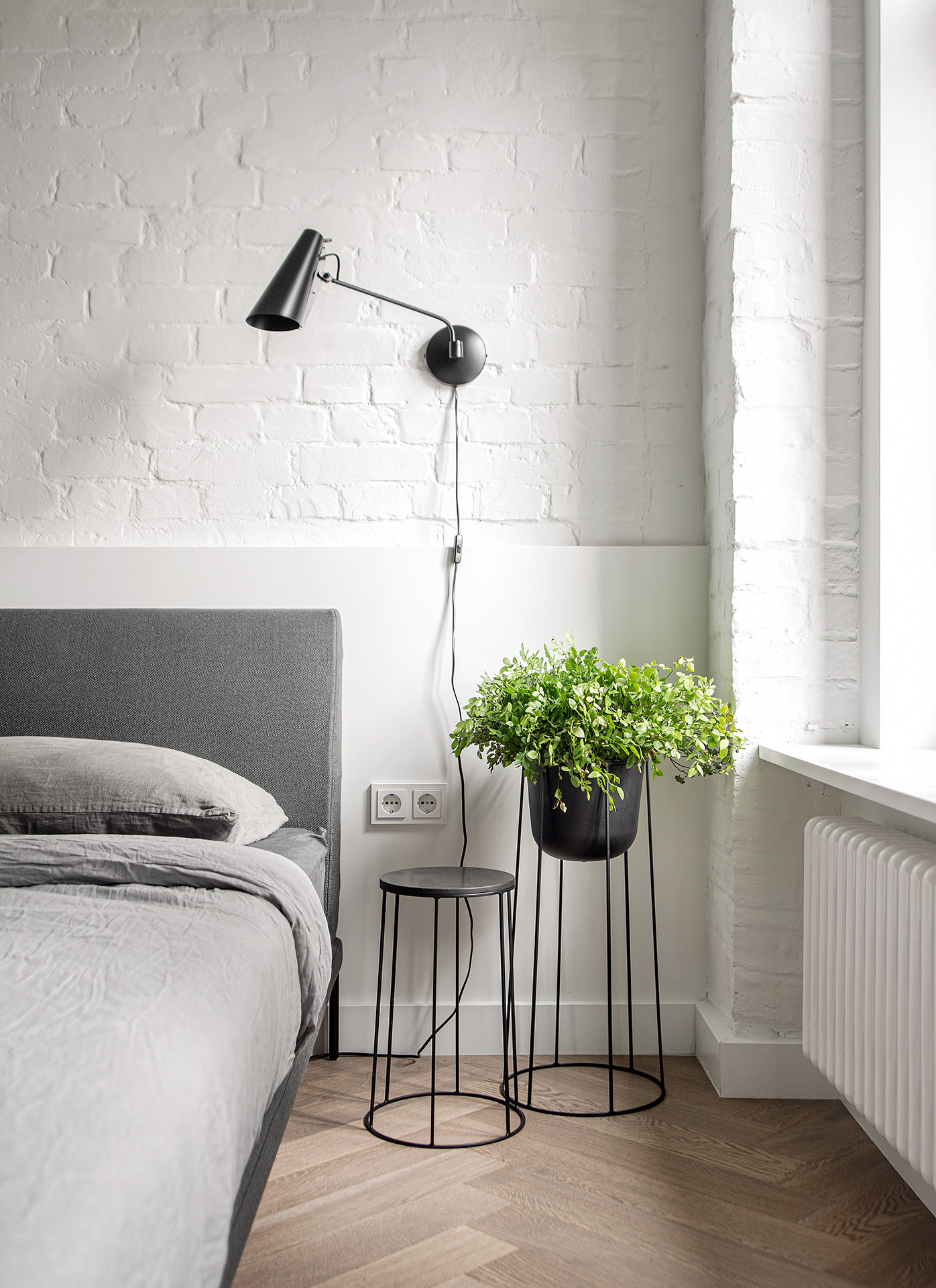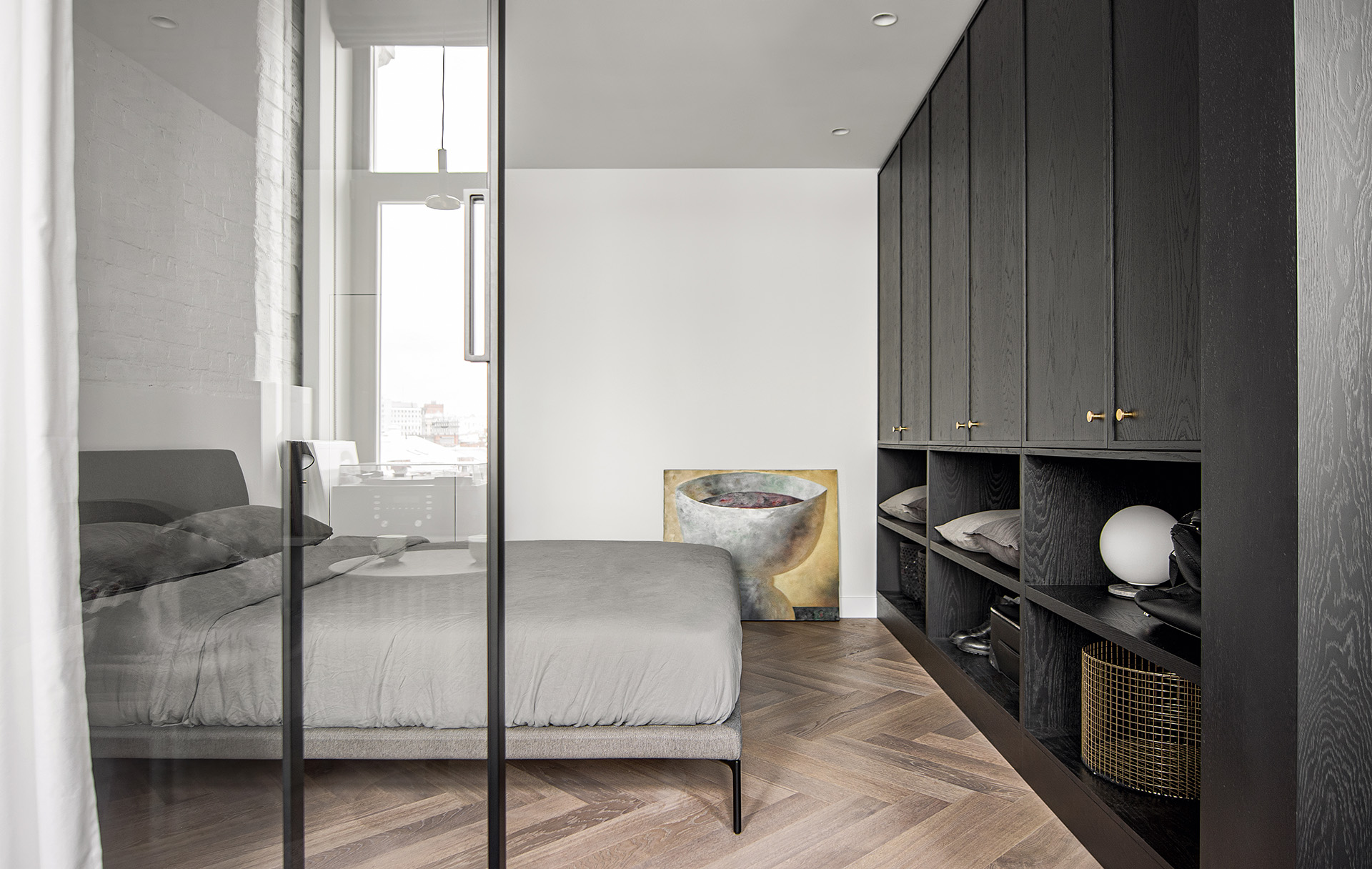 Classic white walls and dark minimalistic furniture contrast is relaxed by warm straw-colored Oak flooring matching the natural wood furniture elements. The classic flooring herringbone pattern underlines the authenticity of brick cladding and concrete ceiling with beams, as well as blends them into the modern interior of this historical building.