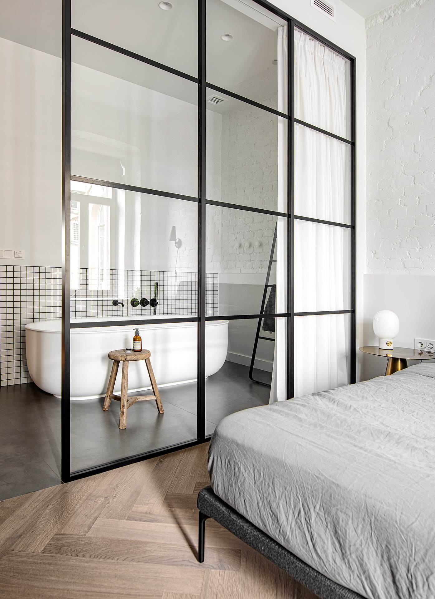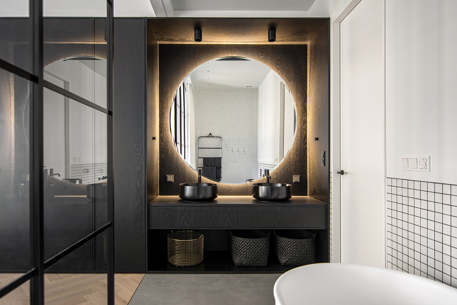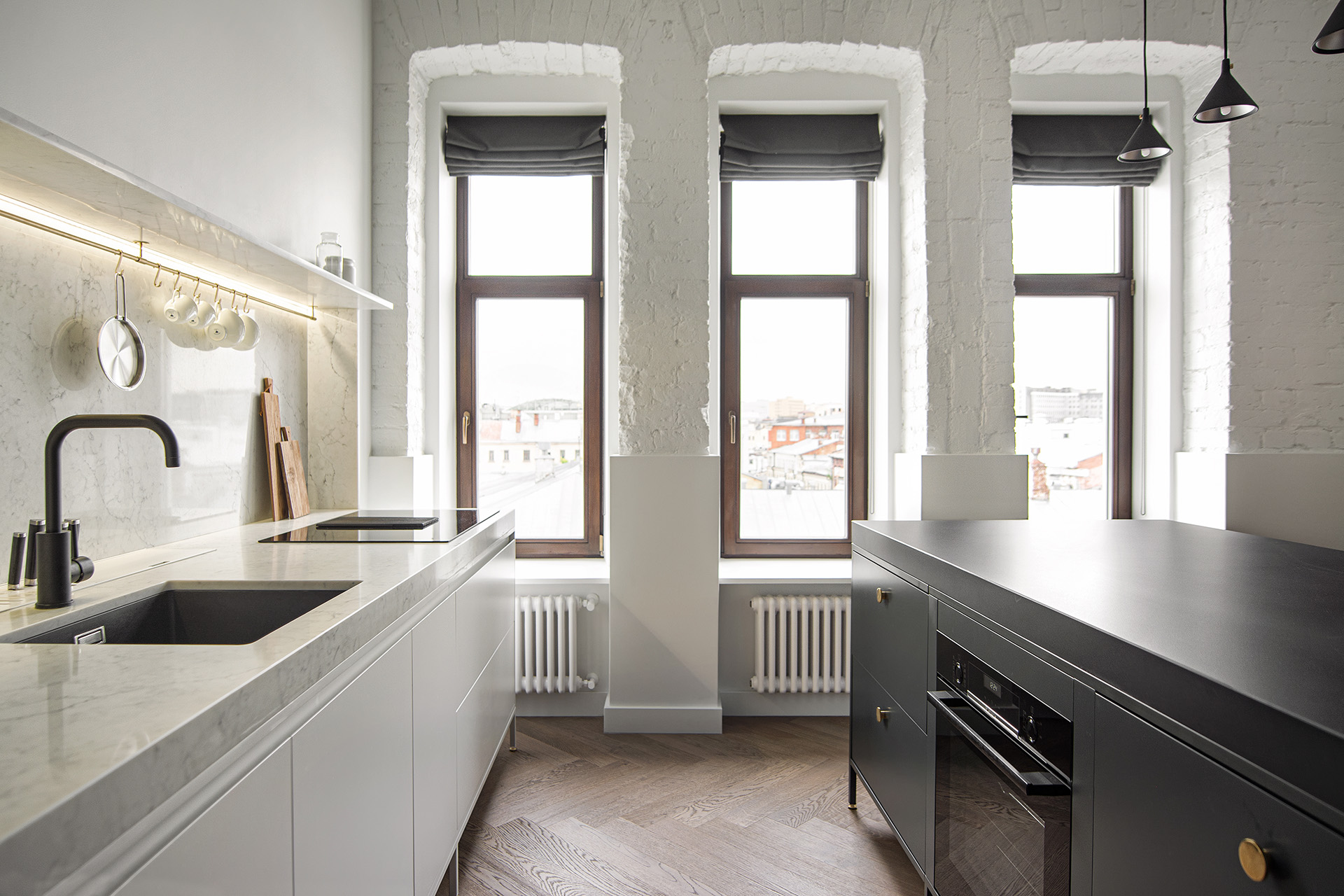 The apartment is located in a historical mansion built at the beginning of XXth century and overlooks an ancient Moscow street. Location did influence the interior design. Historical brick cladding, ceiling wood beams and nine windows were all preserved in the project. Functional part was created with the help of 2 sub-spaces (boxes). One box rooms a guest bedroom and a clauset, mezzanine and a library. The other box functions as a leaving room, bathroom and a kitchen. Dining, sofa and cozy breakfast areas are located around the “boxes”, while master bedroom is in a separate room.
