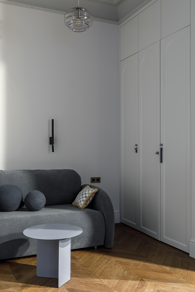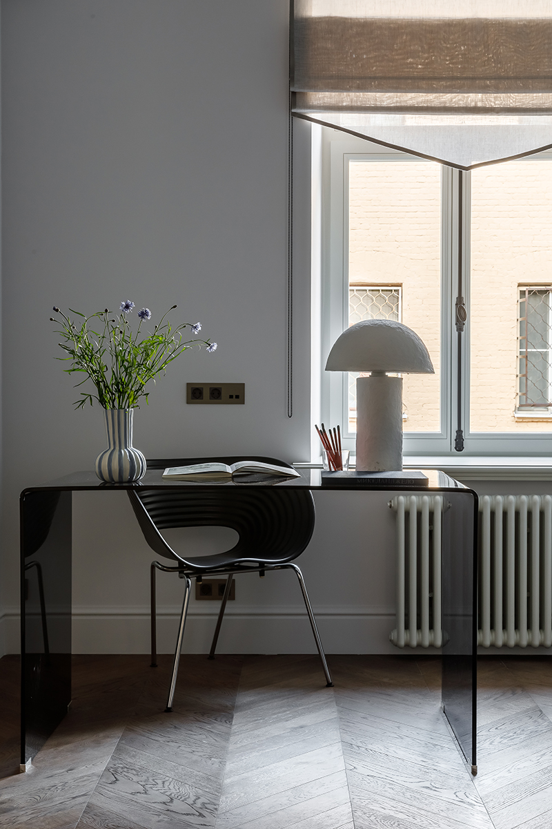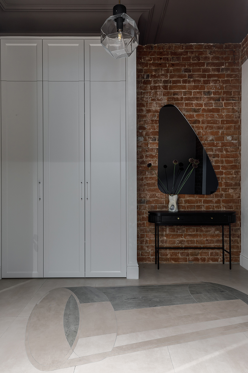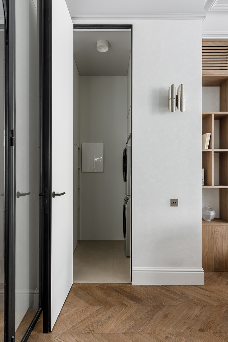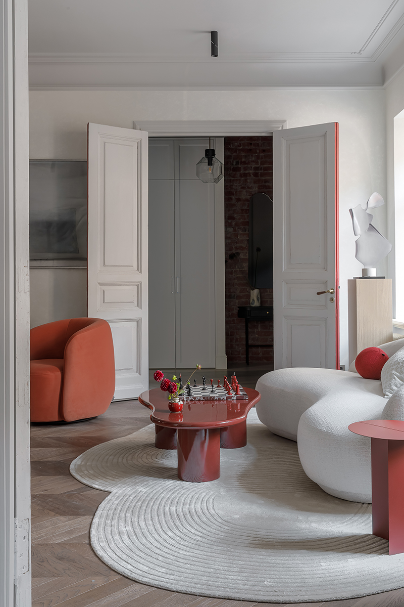 At the core of the project lies a deep respect for historical architecture and authentic proportions of space: the original enfilade layout, characteristic of early 20th-century Moscow apartments, has been preserved. Historic doors and an early-century dining table discovered within the interior were restored and reimagined, while lost elements were recreated with maximum accuracy: the hardwood flooring in Chevron pattern was produced by Coswick company with close reference to historical precedents and the architectural context of the space.