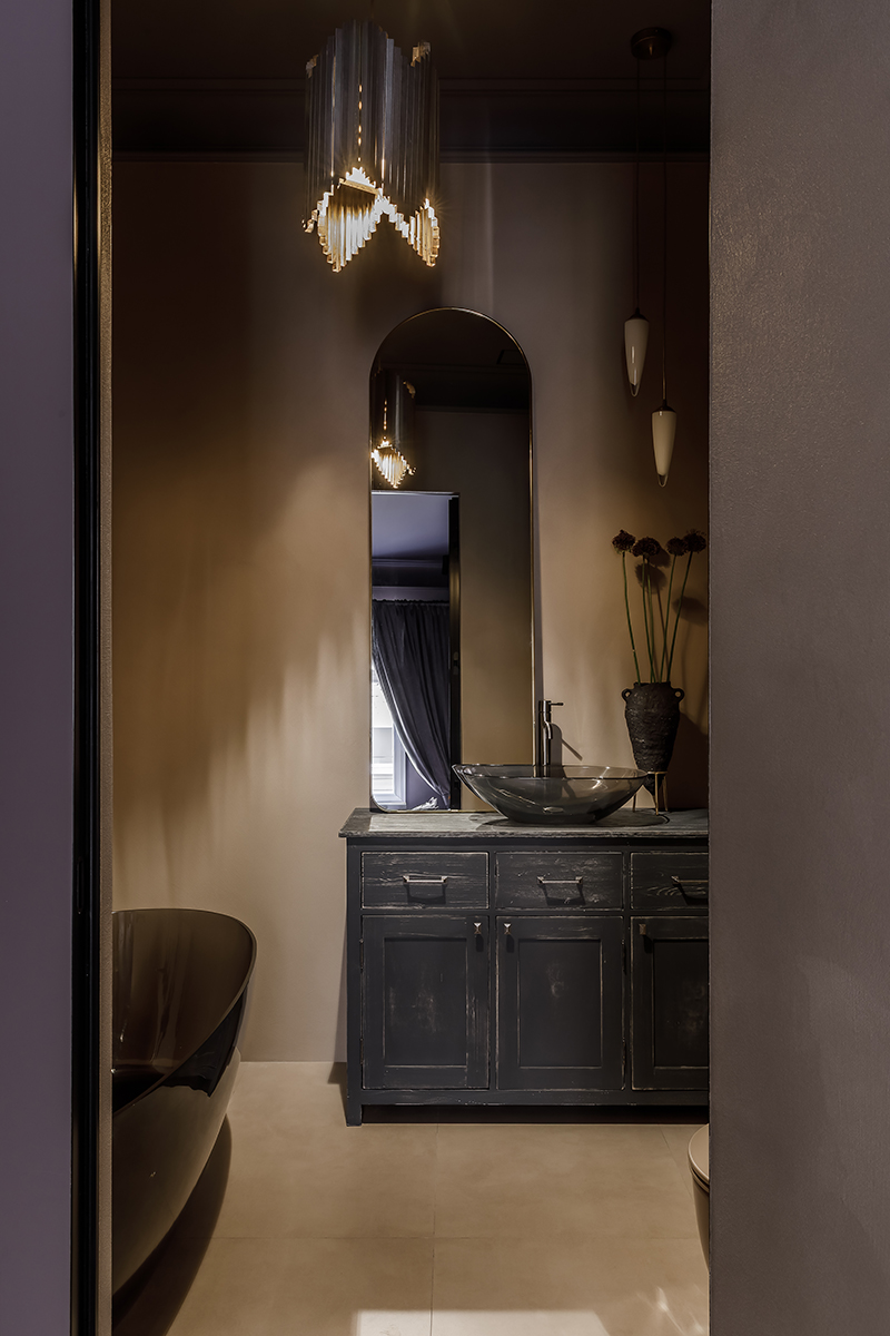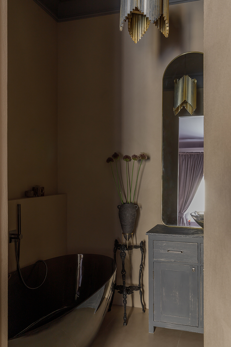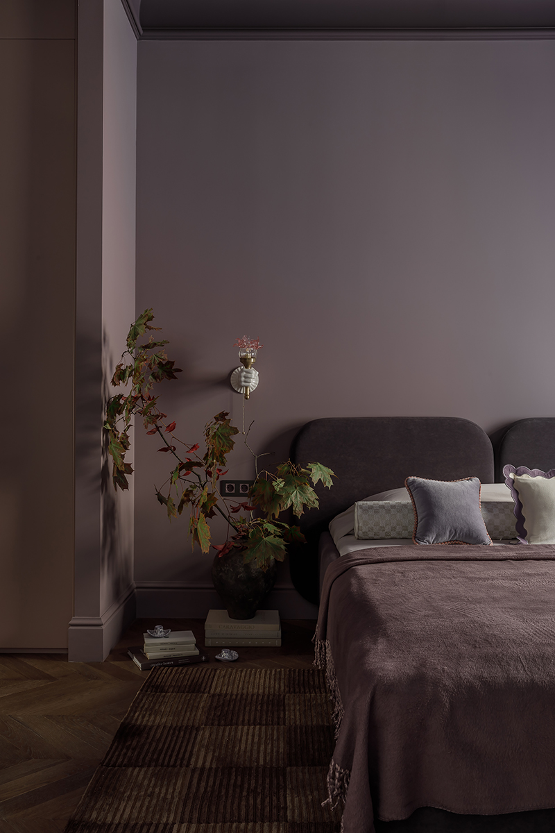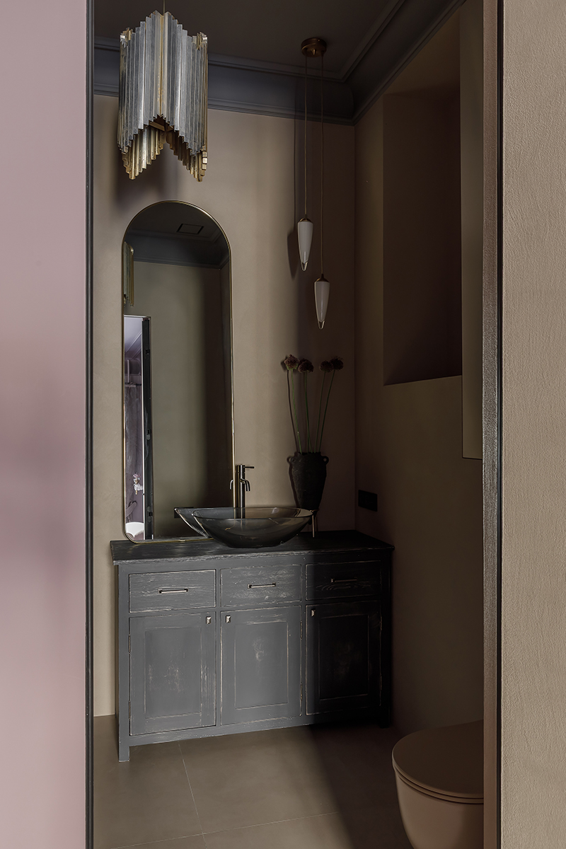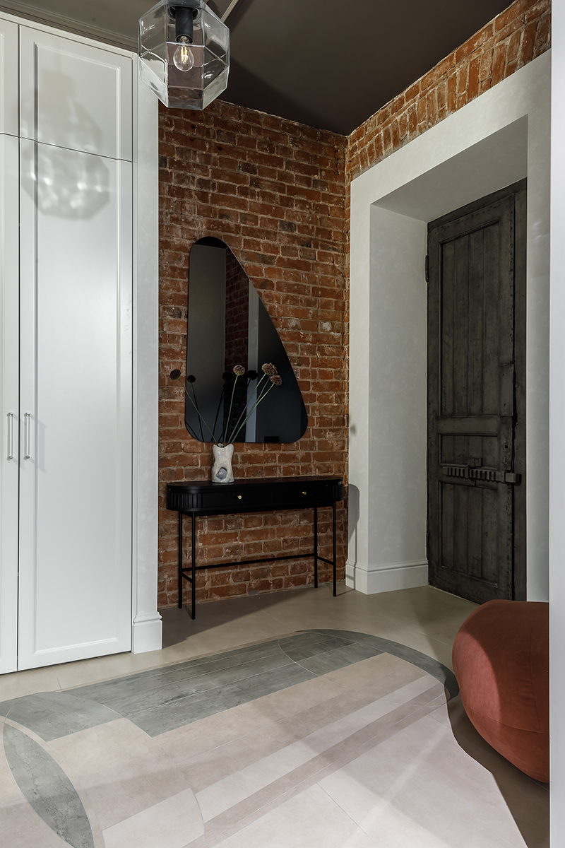 At the core of the project lies a deep respect for historical architecture and authentic proportions of space: the original enfilade layout, characteristic of early 20th-century Moscow apartments, has been preserved. Historic doors and an early-century dining table discovered within the interior were restored and reimagined, while lost elements were recreated with maximum accuracy: the hardwood flooring in Chevron pattern was produced by Coswick company with close reference to historical precedents and the architectural context of the space.