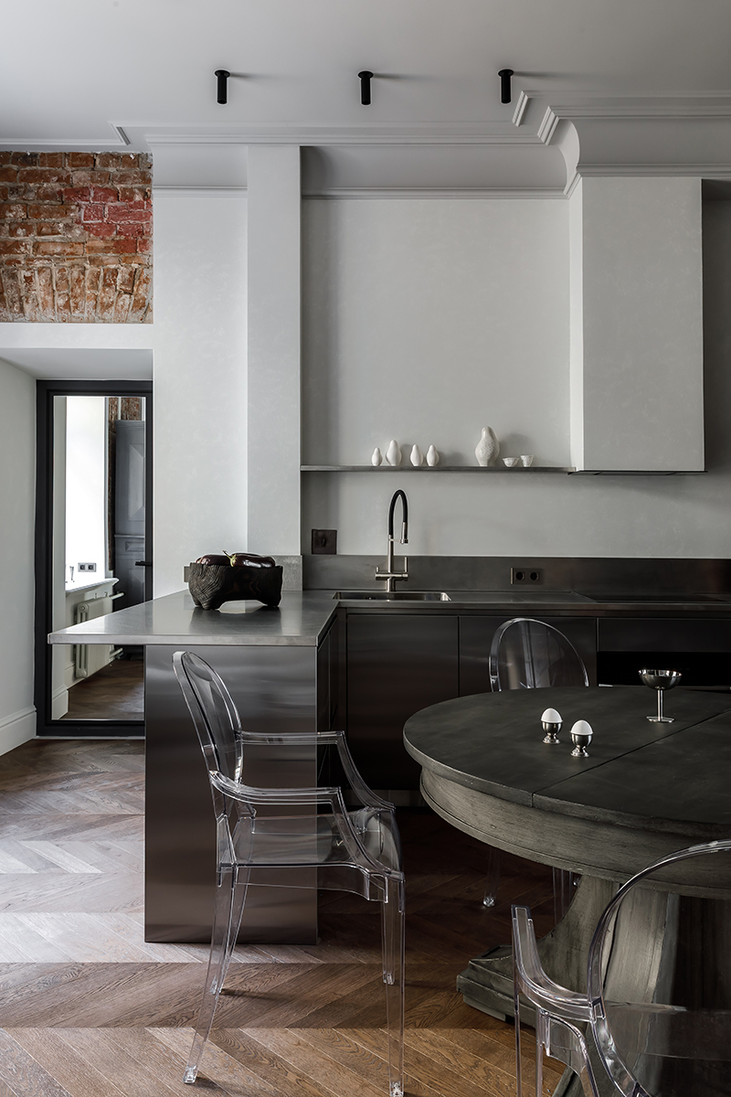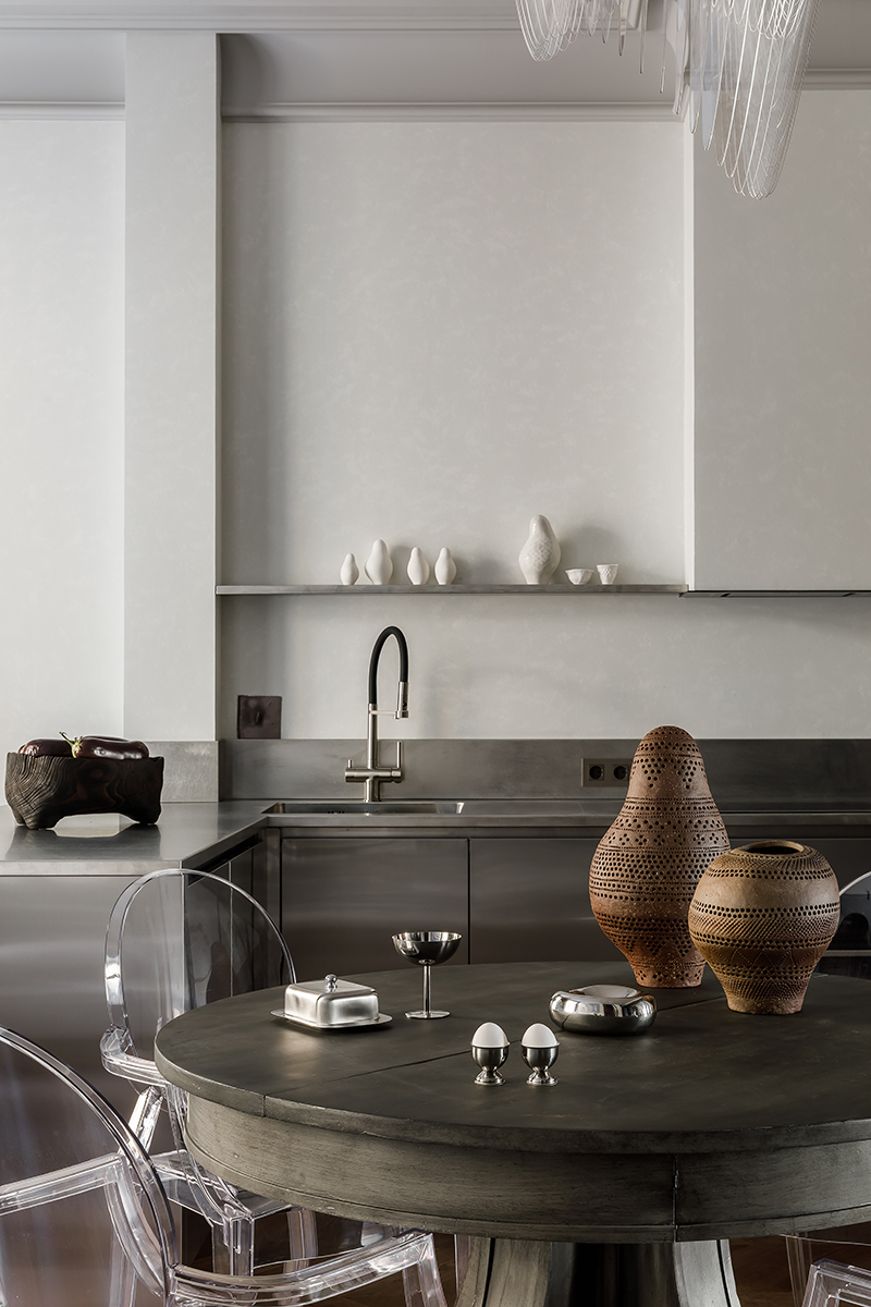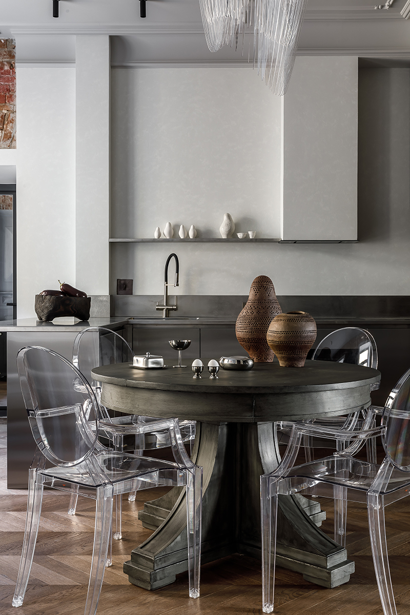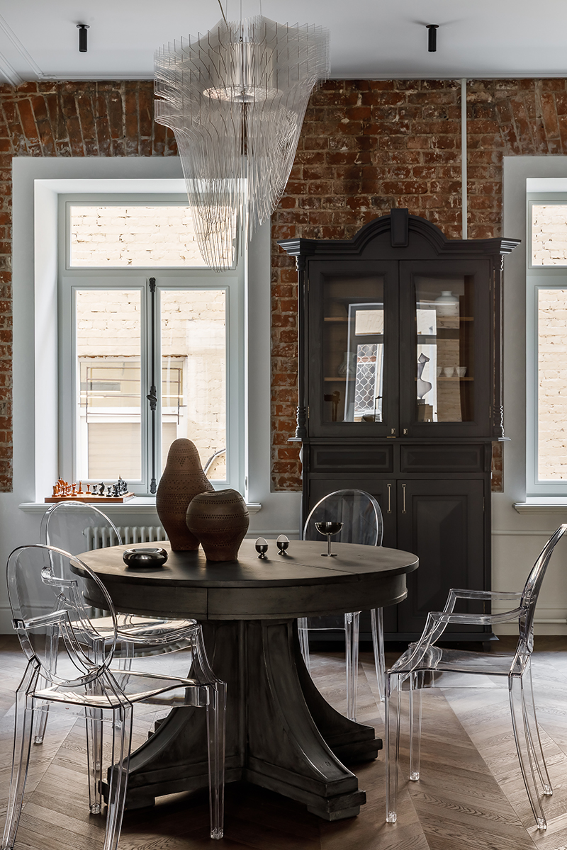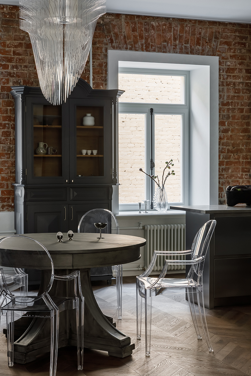 The project’s aesthetic is built on the contrast of eras: a stainless-steel kitchen, a plastic designer chandelier and iconic ghost chairs enter into dialogue with a pre-revolutionary wooden table and classic hardwood flooring.