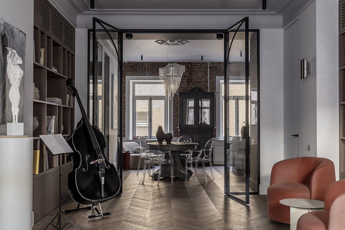 In the very heart of Moscow, within the quiet courtyards of Strastnoy Boulevard, a unique project was born — the apartment-club on Strastnoy — a private club for like-minded individuals — a place for dialogue, reflection and intellectual exchange. Featured on the cover of the architectural online magazine INTERIORS, the space has become an example of a subtle dialogue between past and present — an interior time capsule, carefully preserved and thoughtfully reinterpreted.