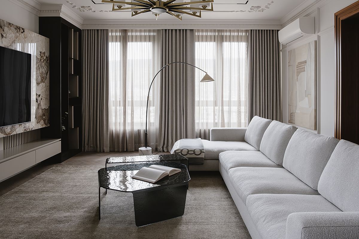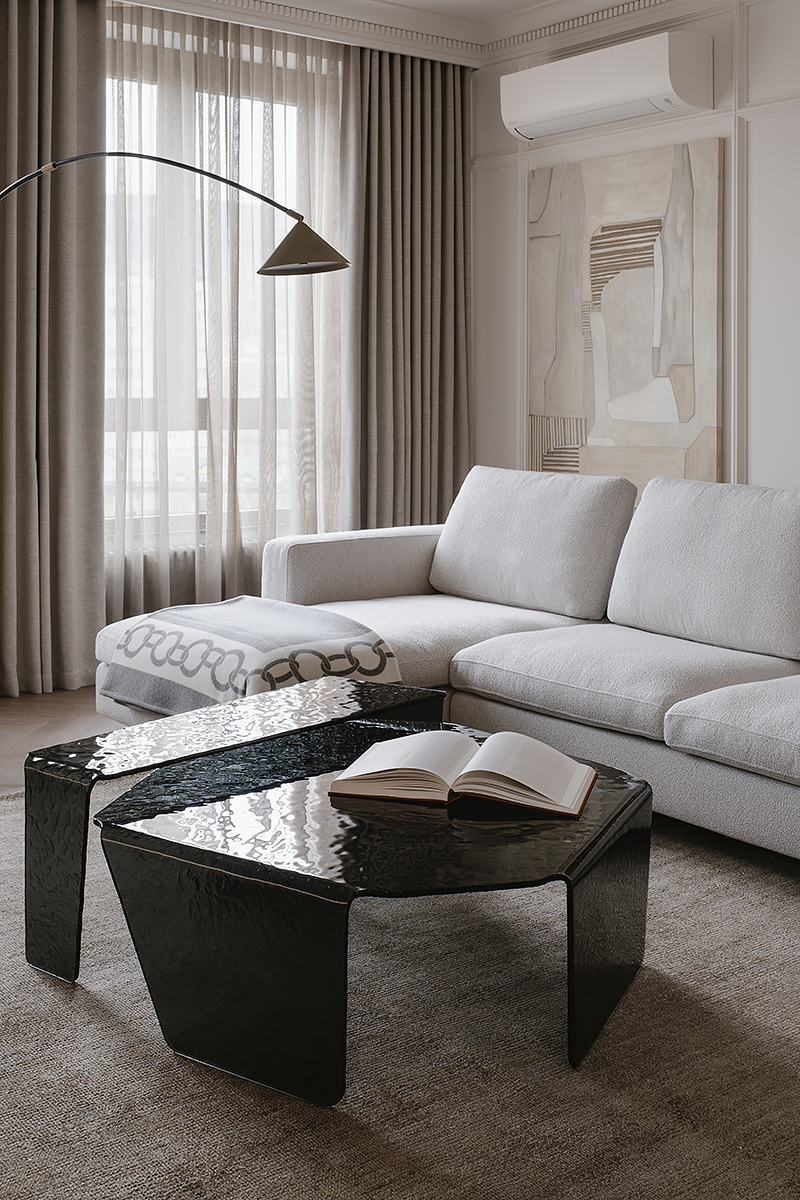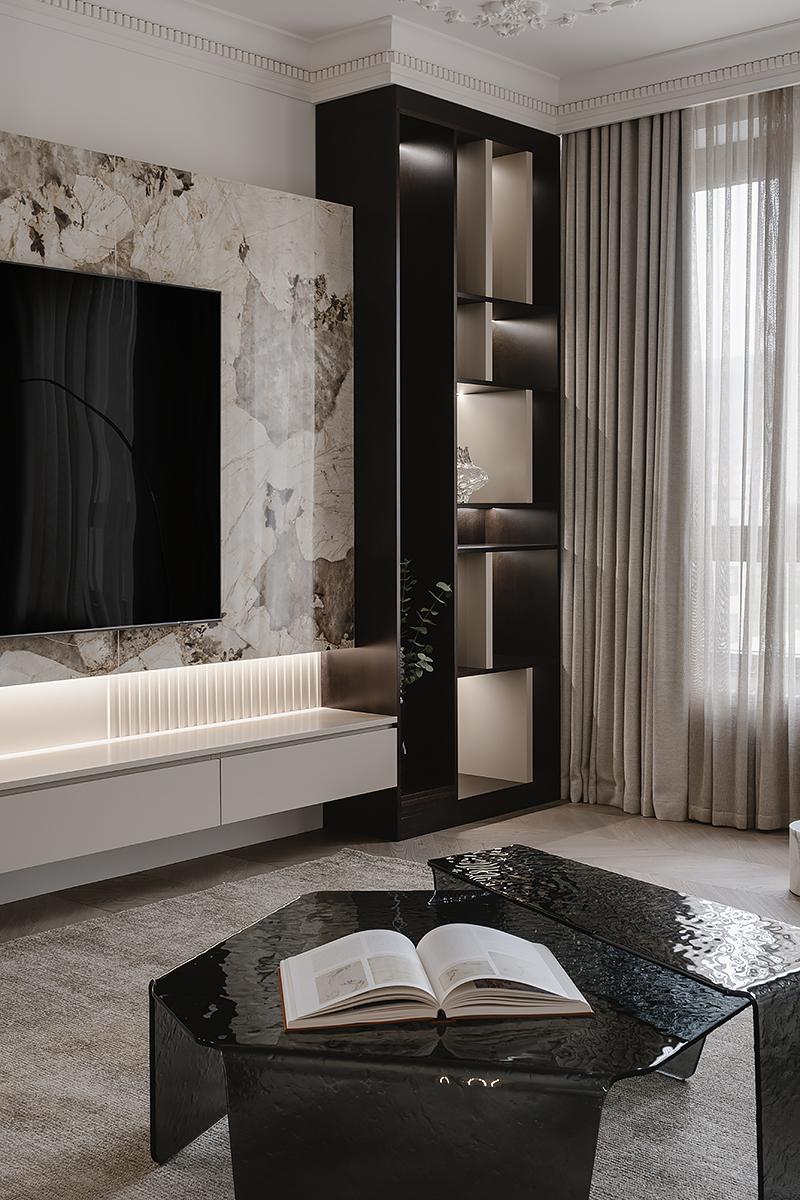 The living room combines lightness with expressive details. Built-in storage with soft lighting, a glass coffee table with a ripple effect and a TV zone finished with Patagonia stone texture create a modern yet inviting atmosphere.