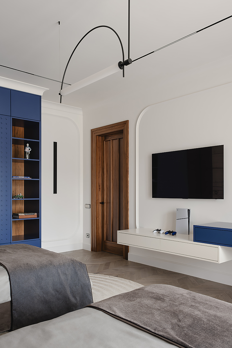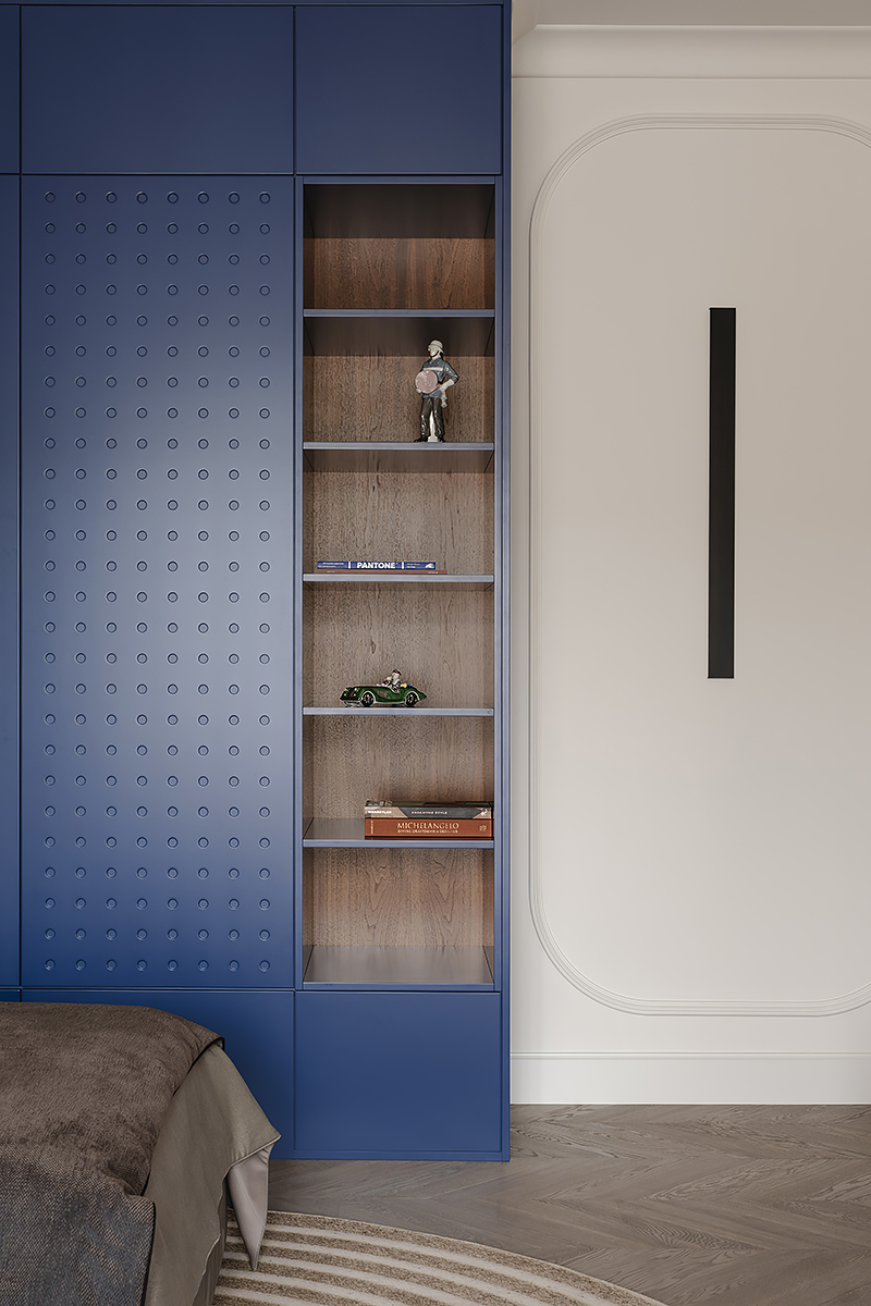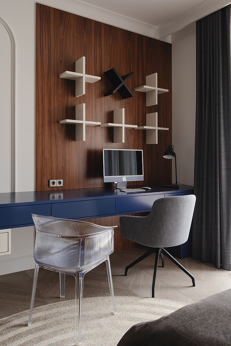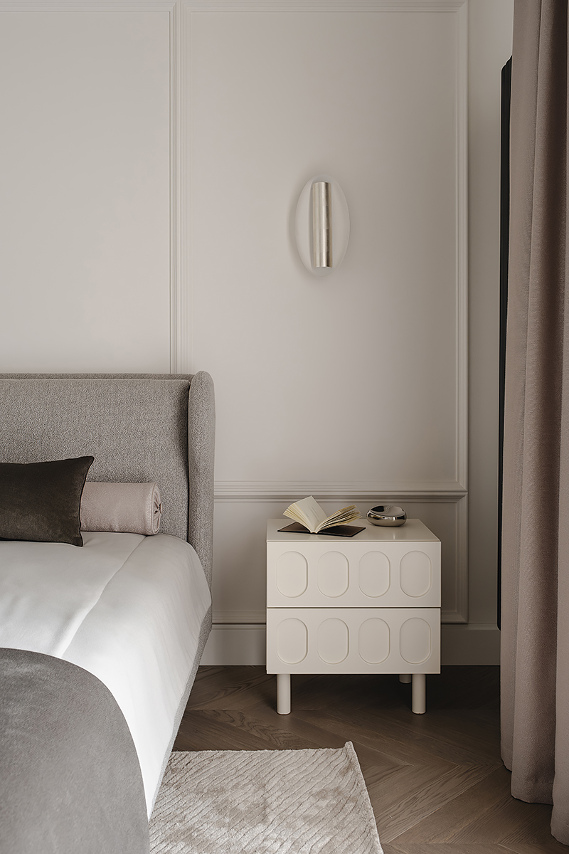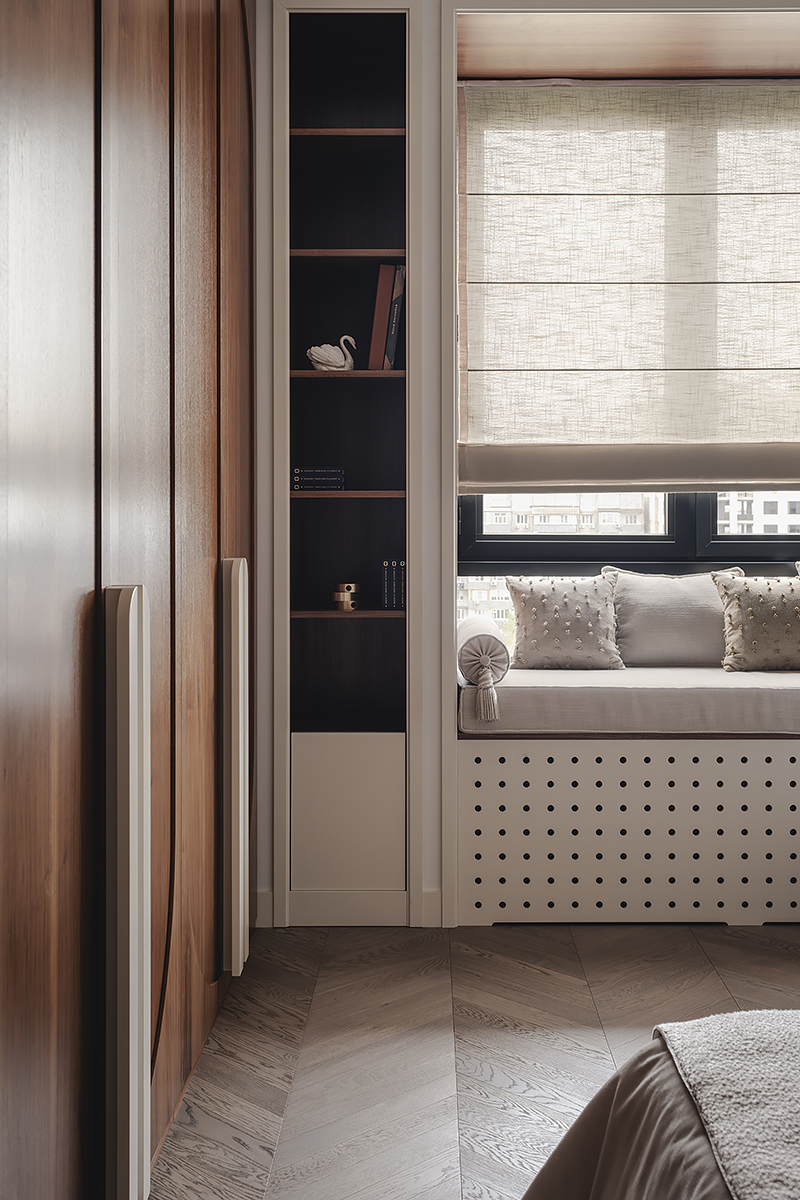 The space is shaped by clear geometry, built-in volumes and thoughtful zoning. Careful attention to proportions, textures and light creates a multi-layered and visually rich environment.
