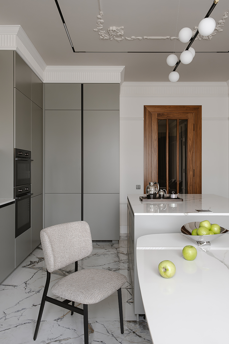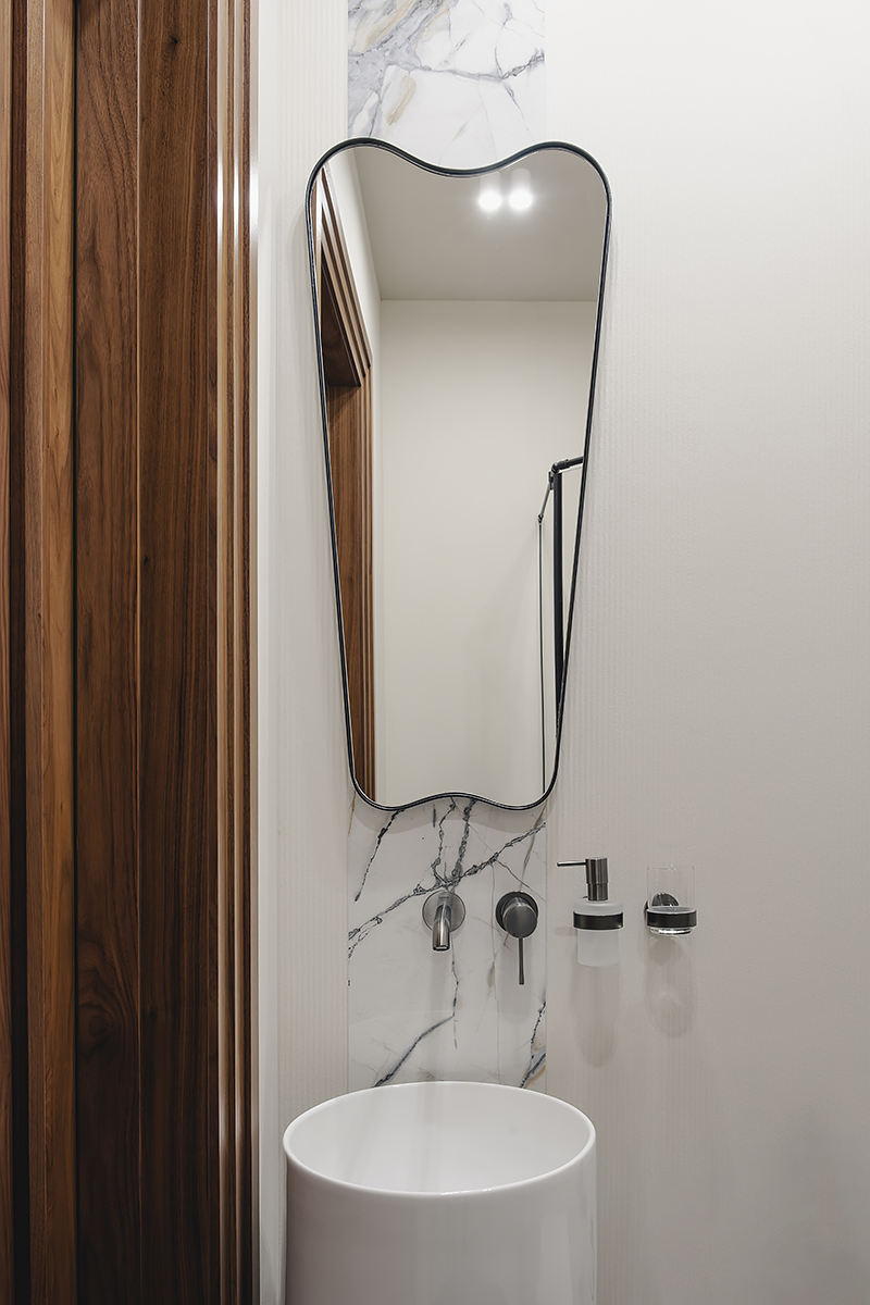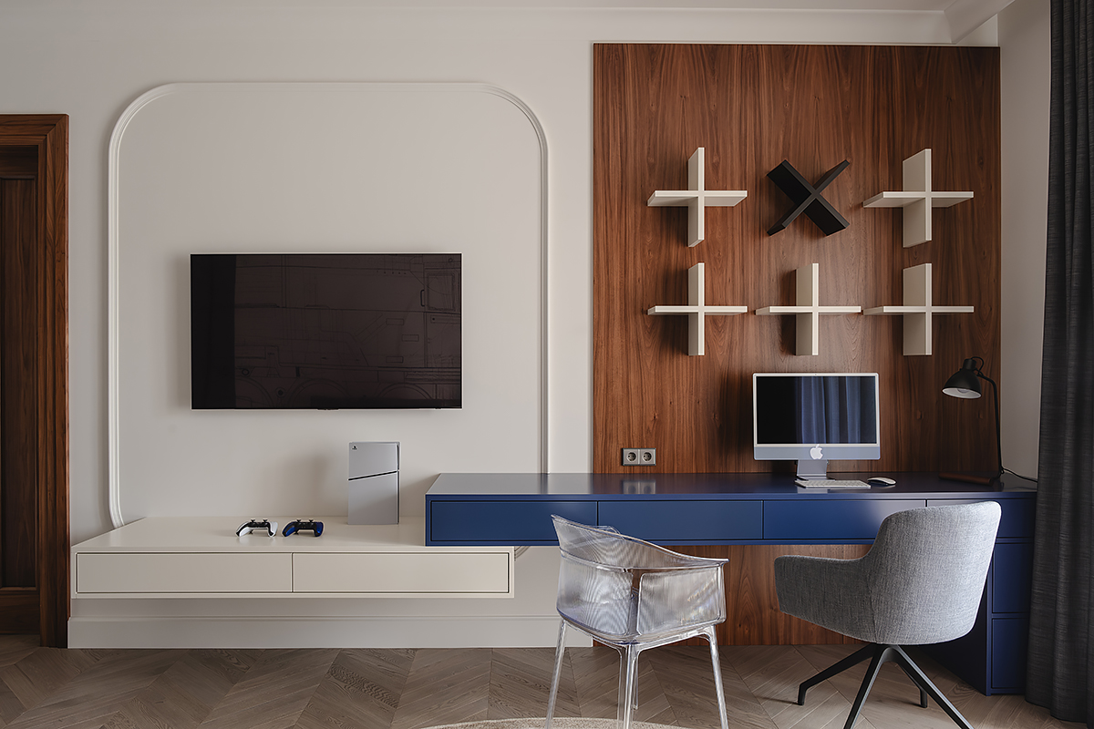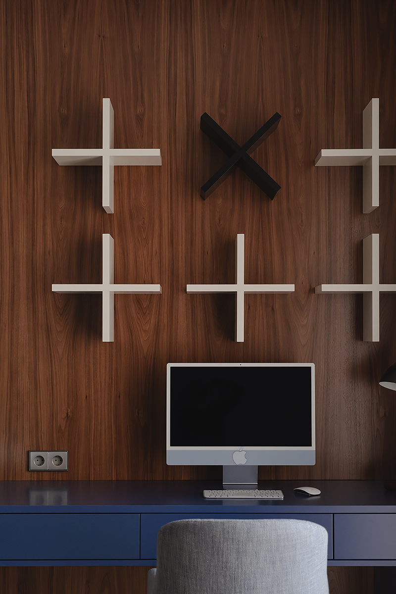 The space is shaped by clear geometry, built-in volumes and thoughtful zoning. Careful attention to proportions, textures and light creates a multi-layered and visually rich environment.