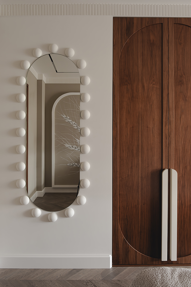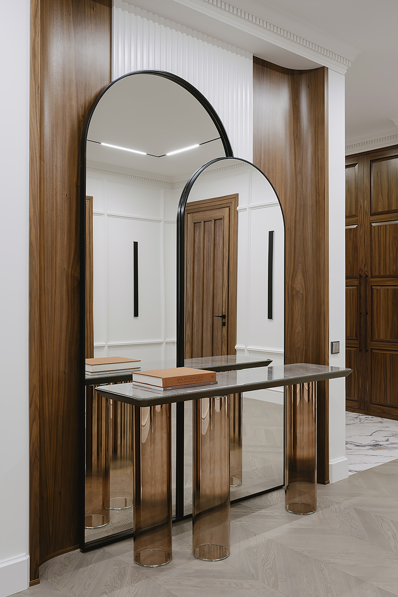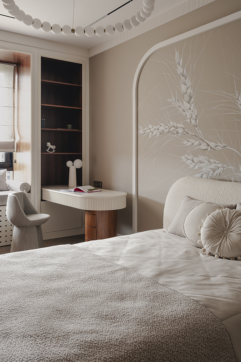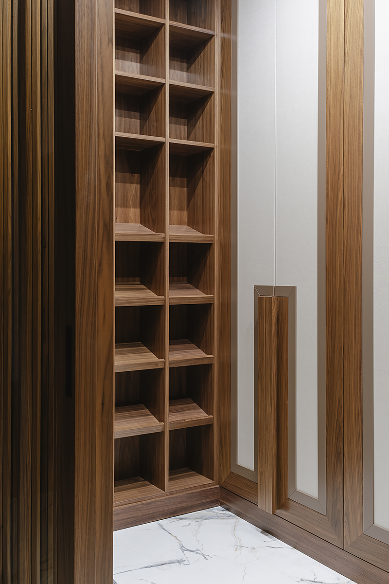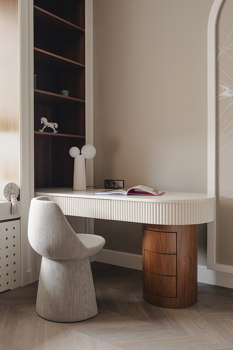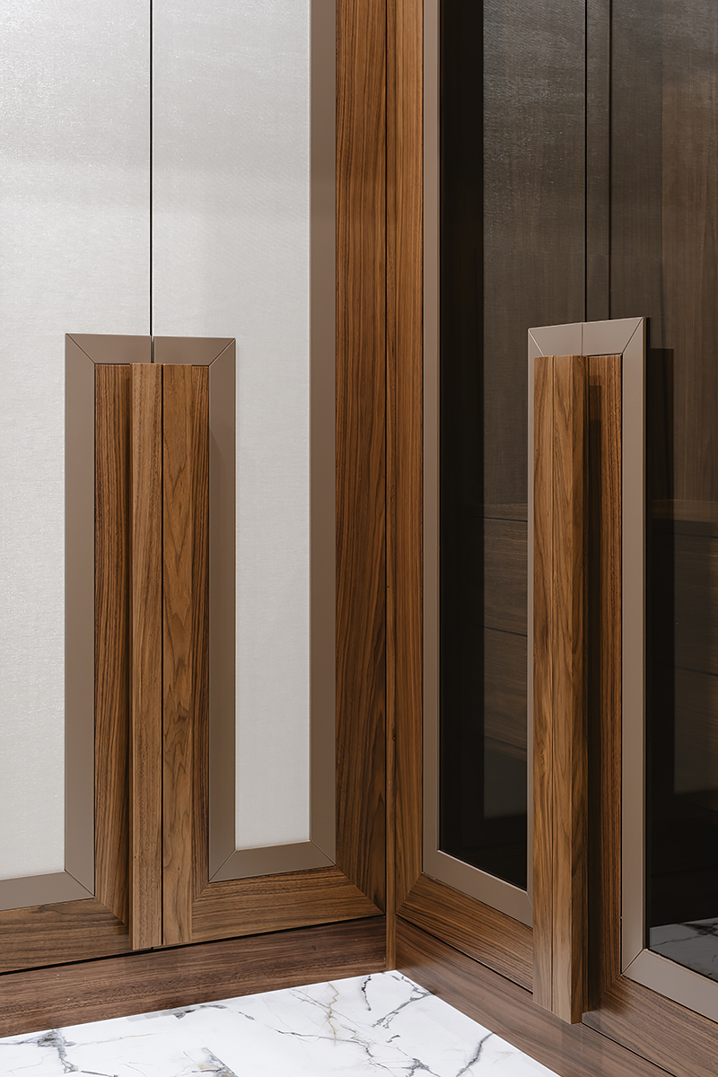 Private areas are defined by natural materials and soft textures. American walnut furniture and doors add a sense of refinement, while glass and curved panels introduce subtle, elegant accents.