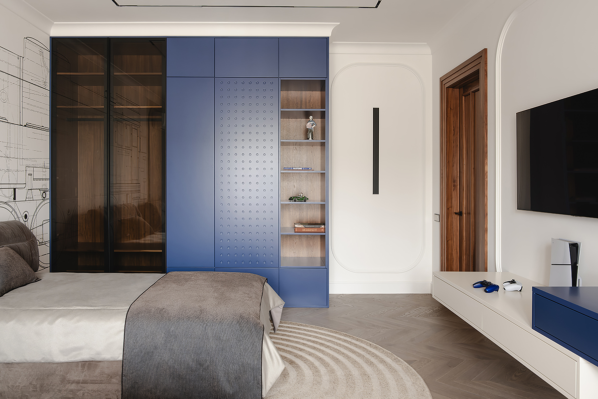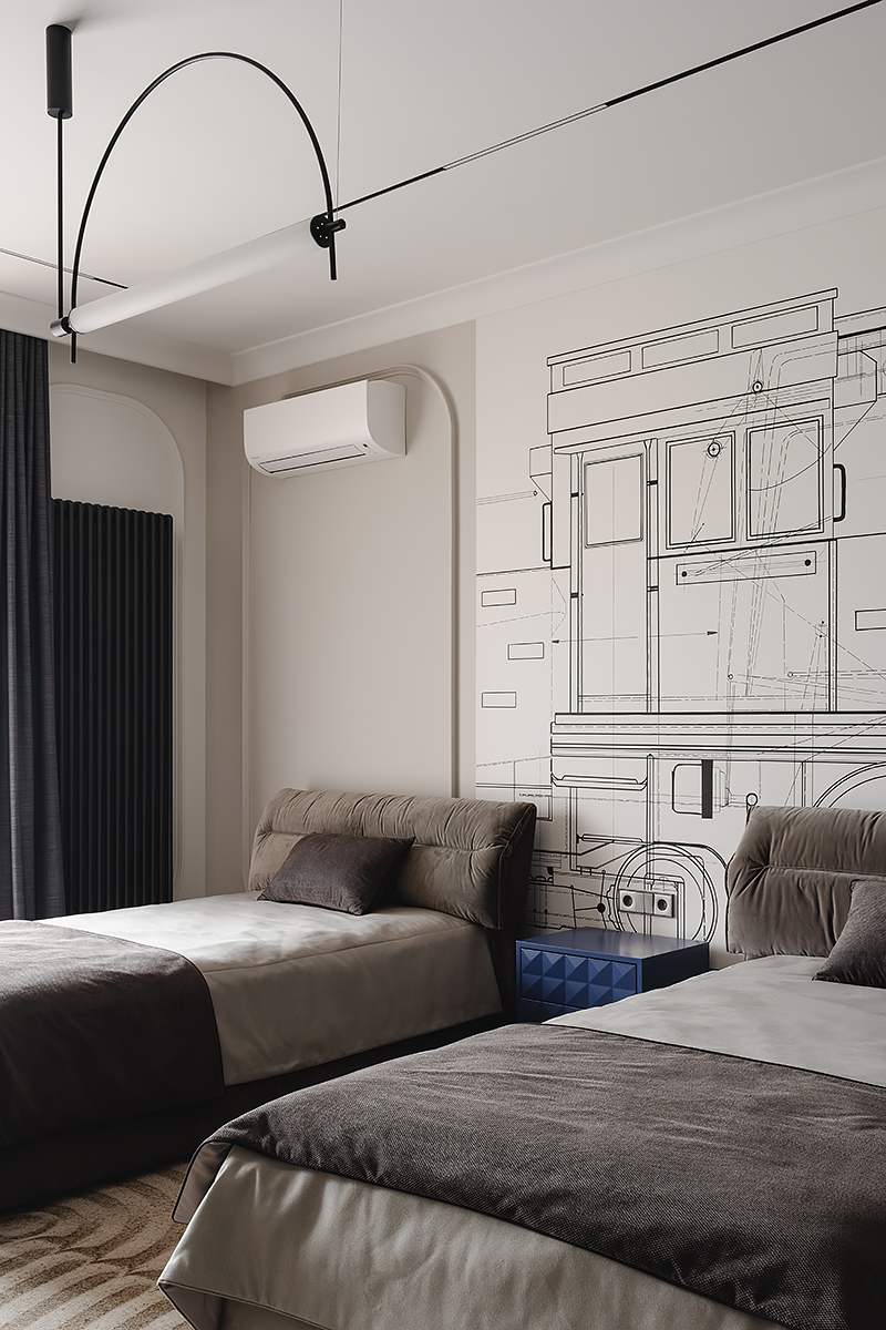 The children’s room is designed as a multifunctional environment for living, playing and studying. A custom wall painting — a detailed drawing resembling a technical sketch — adds a distinctive character to the space.