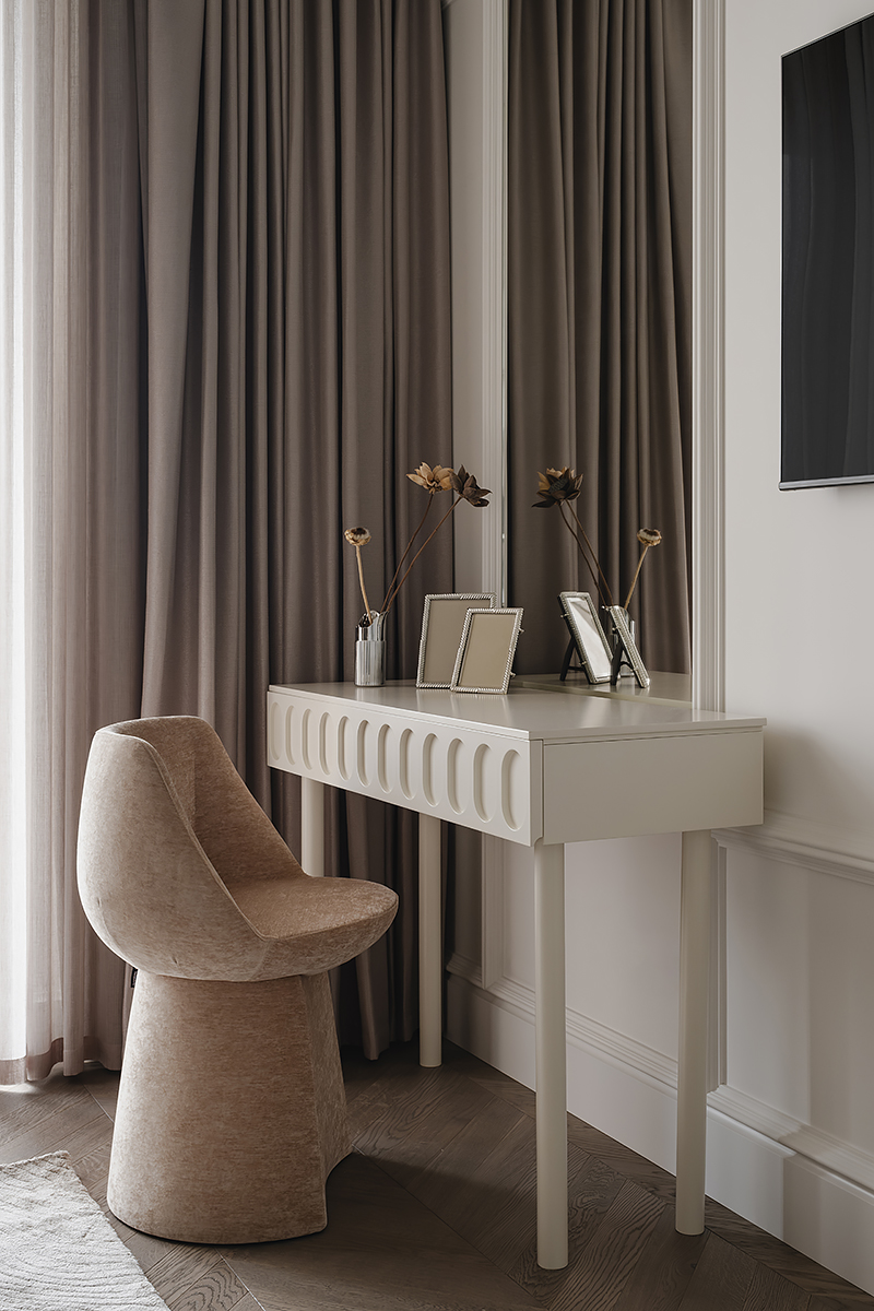 The interior of this apartment is designed as a cohesive and calm space, where each area is seamlessly integrated into the overall architecture. The project is based on a balance of aesthetics, functionality and a deep appreciation for natural materials.