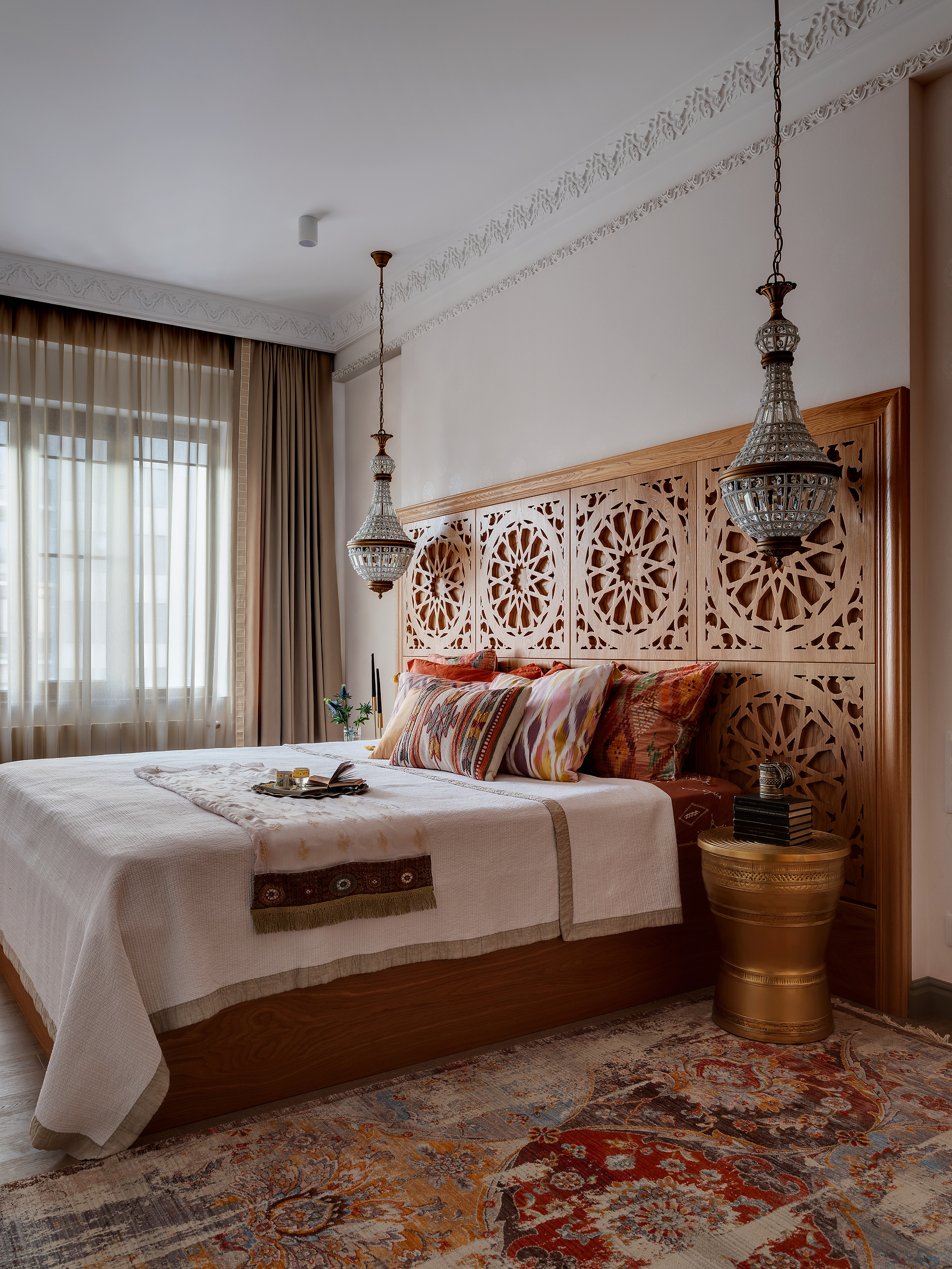 Each room has its own statement. It not only decorates the interior, but also assume the function of ethnic reference. An impressive carved headboard and stucco molding on the walls in the bedroom.