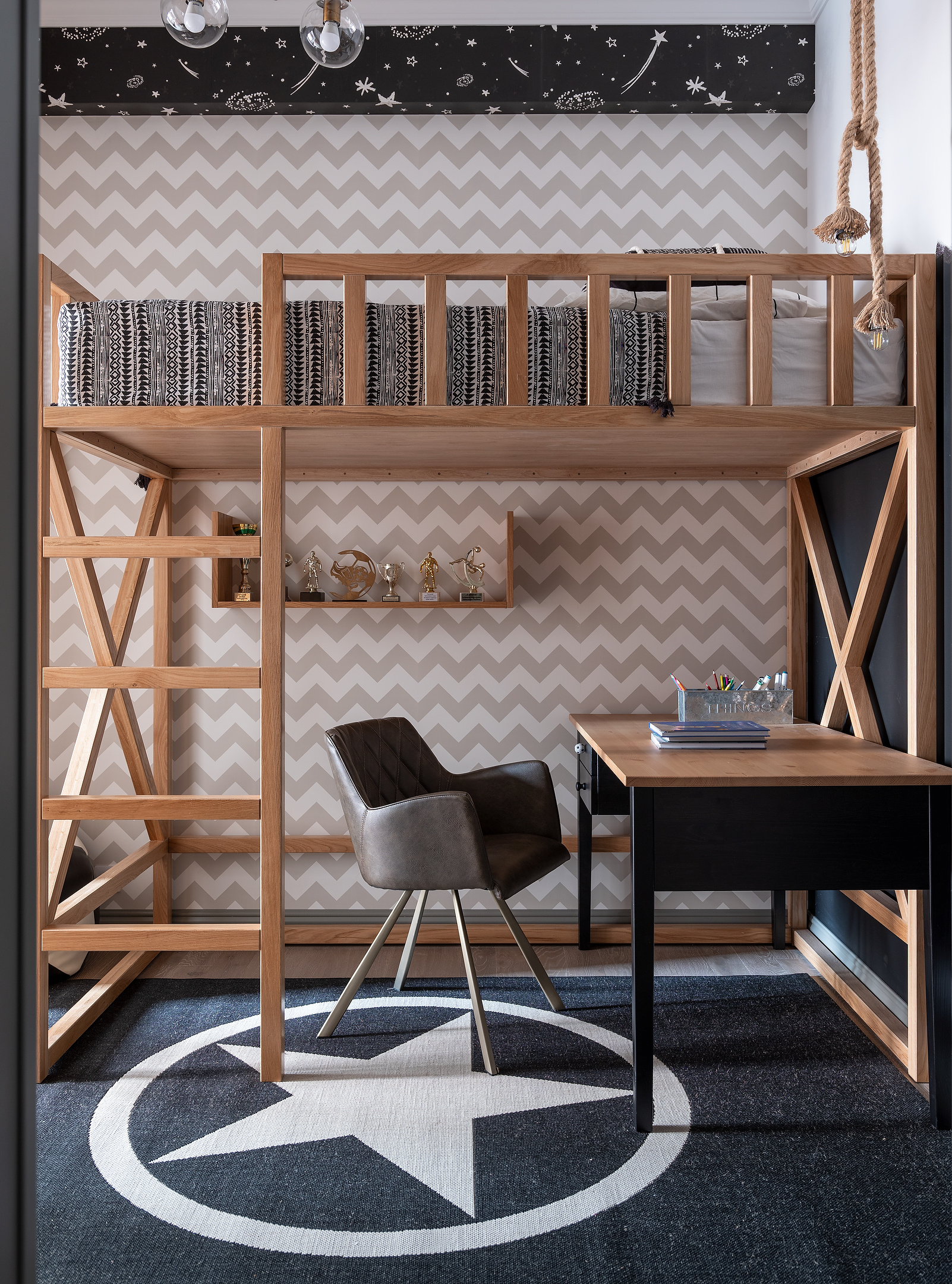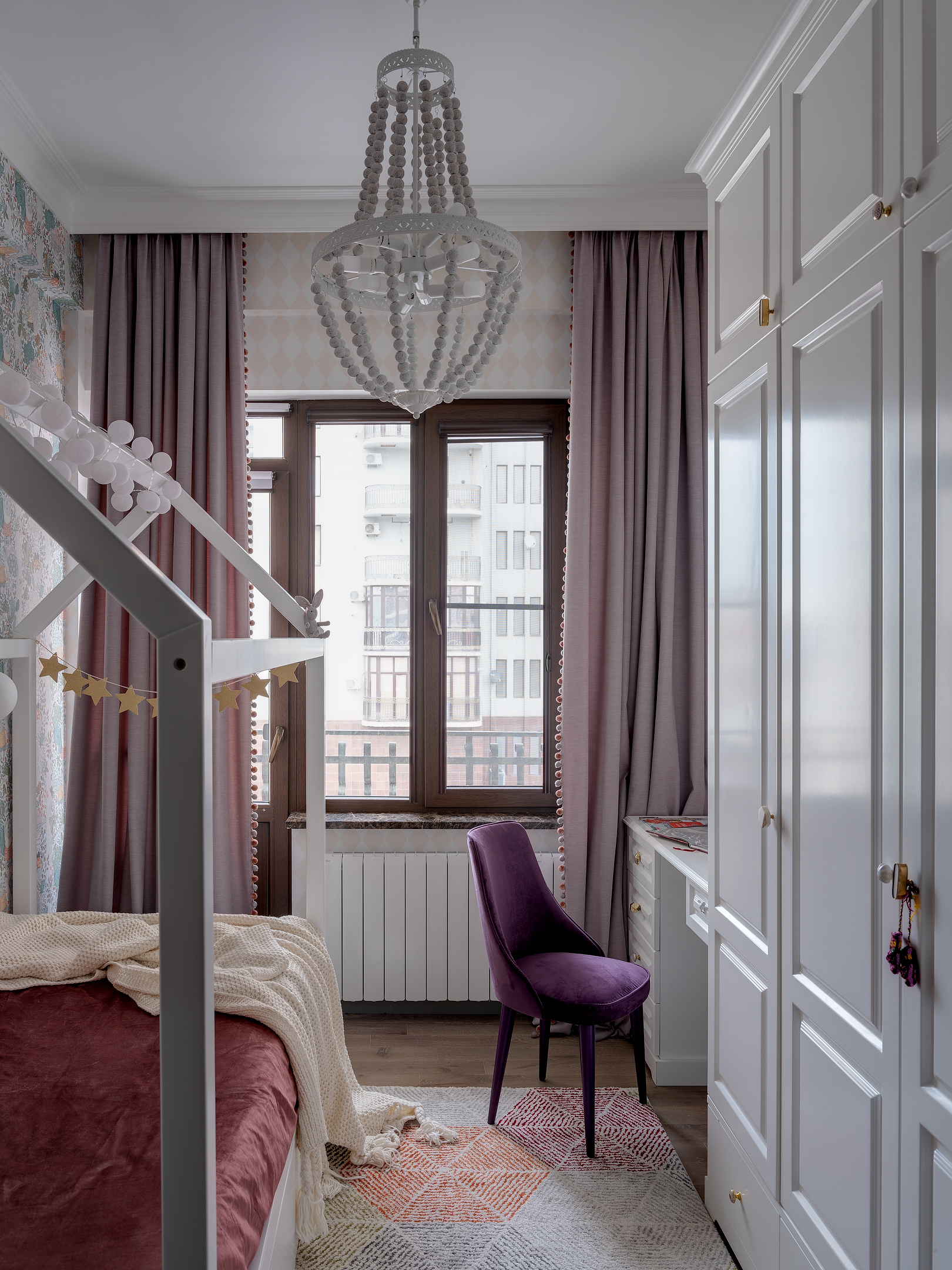 Massive decor elements and atmospheric design were the central point. All materials were chosen based on the principle of texture, complexity of patterns and colors. There were two problems with the layout. Firstly, designer leveraged the load-bearing crossbars and columns. Secondly, the children’s room was divided in half using sliding doors with a penile system.