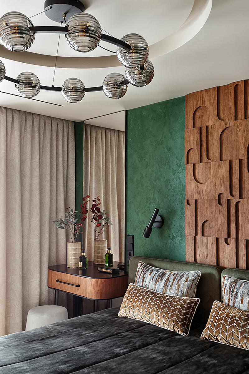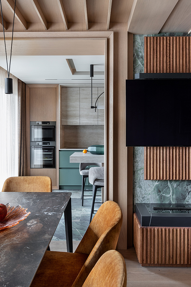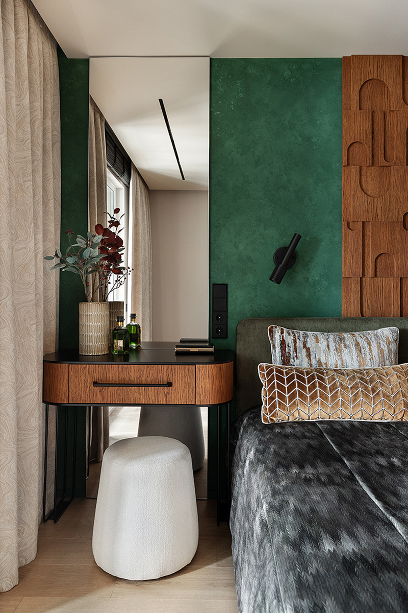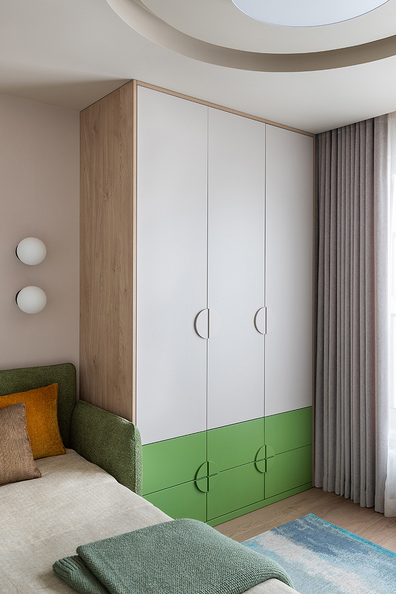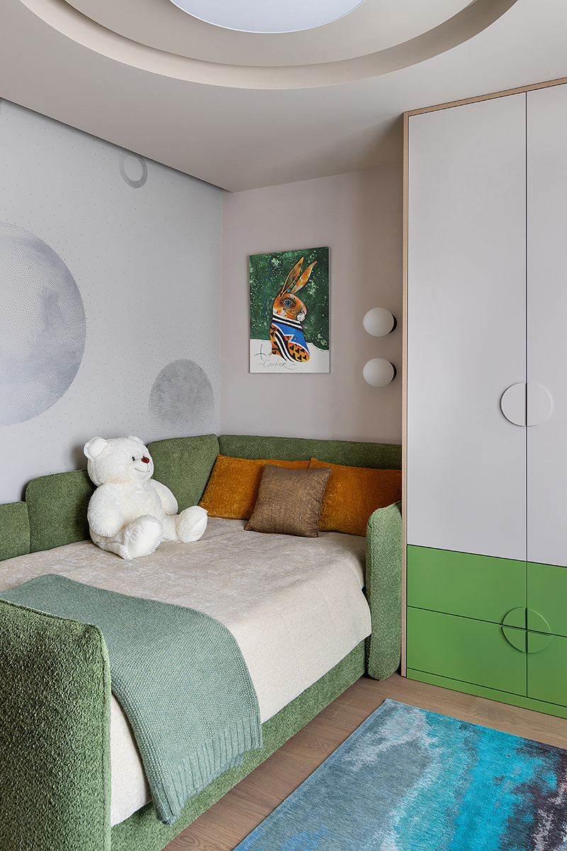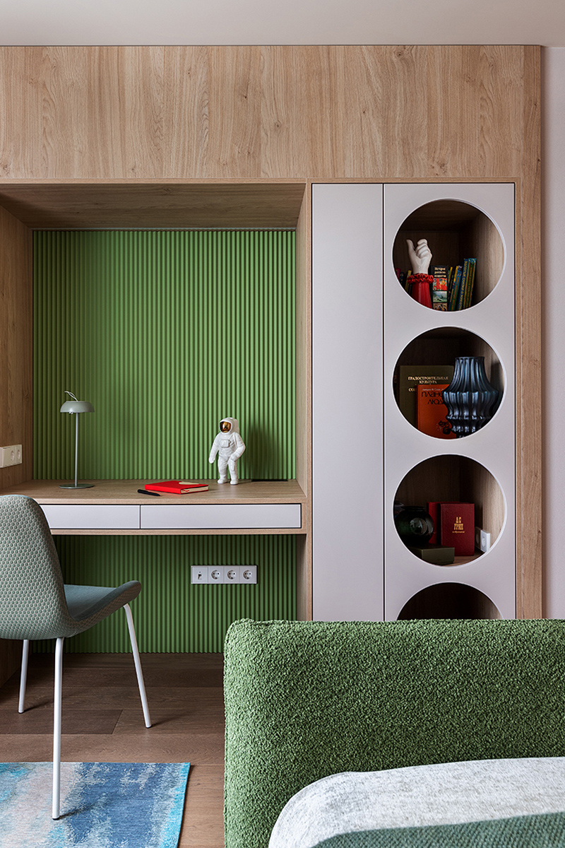 A mix of wood veneers and a variety of green accents create a multifaceted space: it constantly reveals itself in new ways, inviting you to notice details and enjoy subtle nuances. The compact kitchen with an island is carefully designed to combine functionality with a sense of lightness. The living area is filled with natural light and warmth of oak veneer, while vertical slats and mirror inserts create a play of depth and a feeling of openness. In the bedroom, a unique handcrafted decorative panel accents the space, transforming it into an intimate and atmospheric retreat. Special attention was given to the children’s rooms: they follow the same style as the overall interior, yet are enhanced with bright accents and functional solutions for play and study.