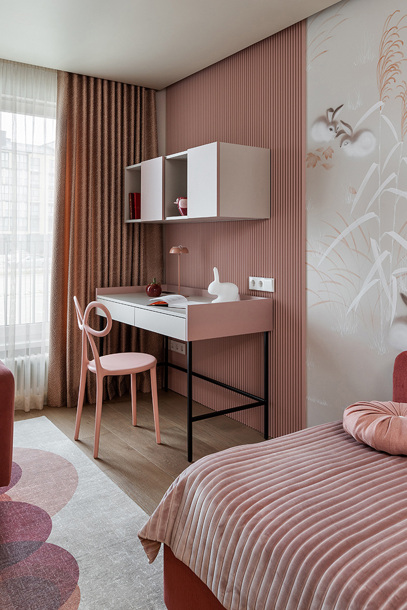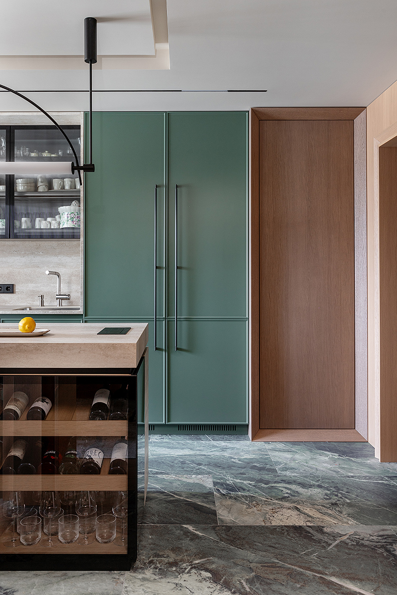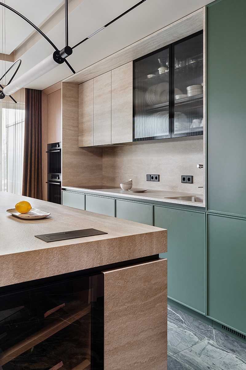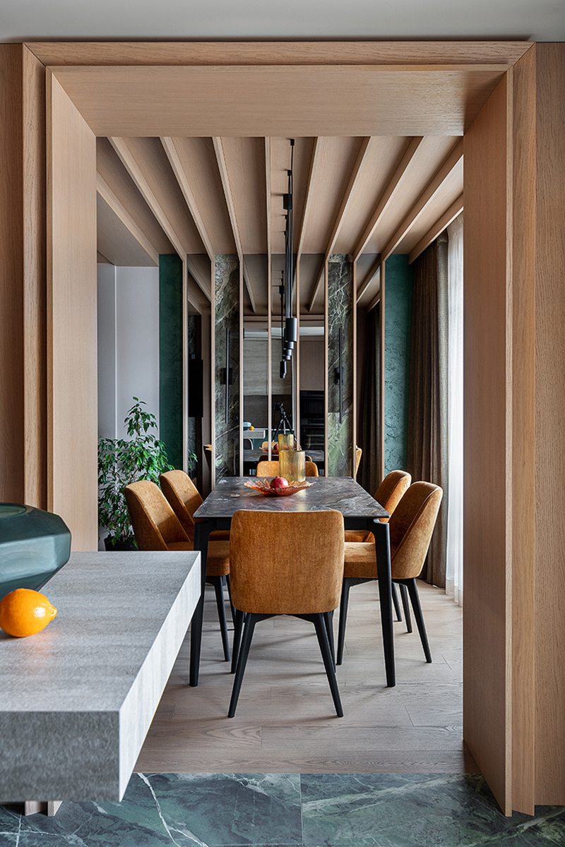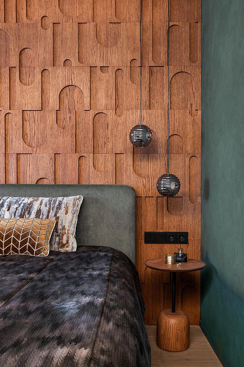 A mix of wood veneers and a variety of green accents create a multifaceted space: it constantly reveals itself in new ways, inviting you to notice details and enjoy subtle nuances. The compact kitchen with an island is carefully designed to combine functionality with a sense of lightness. The living area is filled with natural light and warmth of oak veneer, while vertical slats and mirror inserts create a play of depth and a feeling of openness. In the bedroom, a unique handcrafted decorative panel accents the space, transforming it into an intimate and atmospheric retreat. Special attention was given to the children’s rooms: they follow the same style as the overall interior, yet are enhanced with bright accents and functional solutions for play and study.