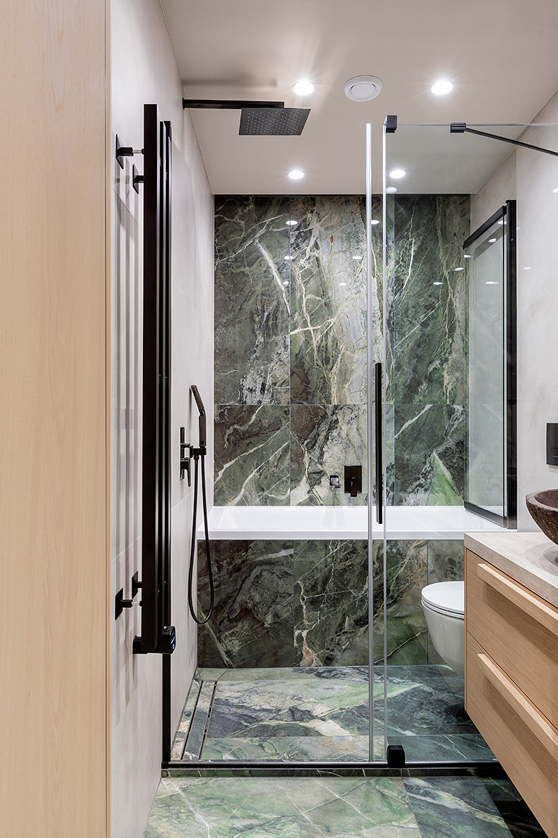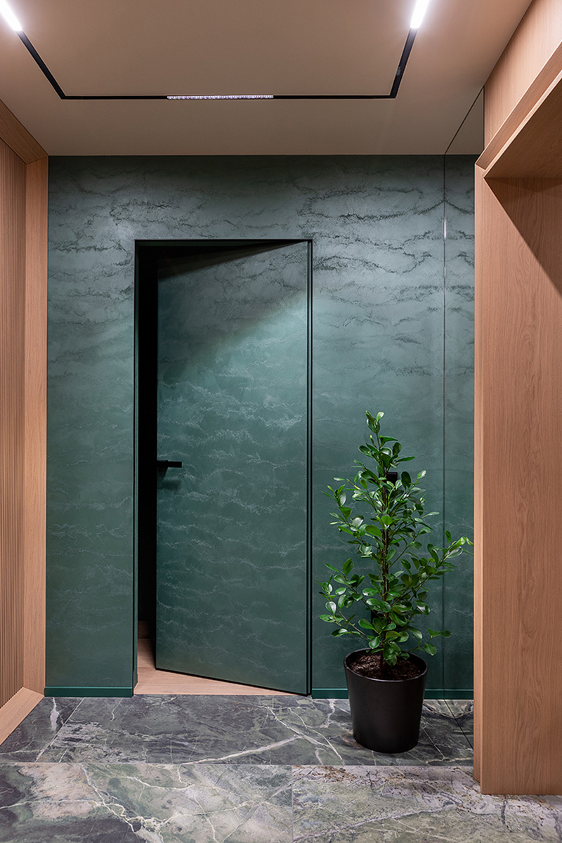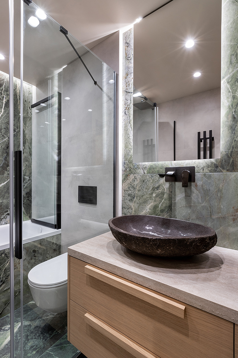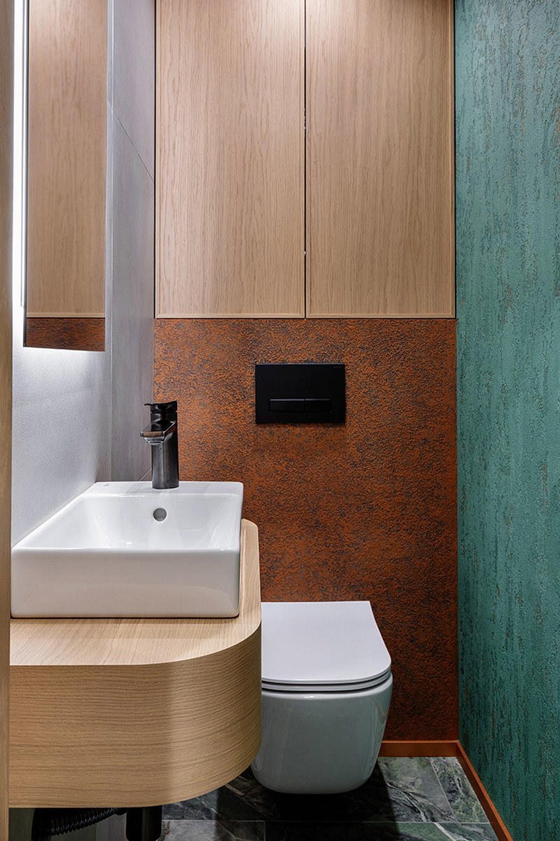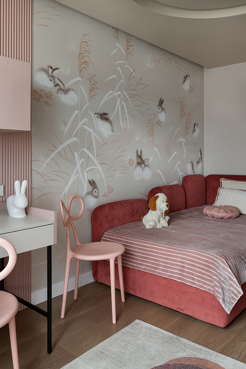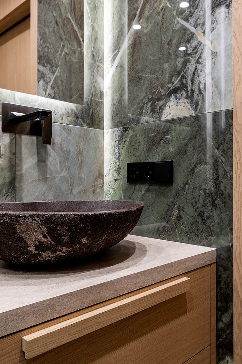 A mix of wood veneers and a variety of green accents create a multifaceted space: it constantly reveals itself in new ways, inviting you to notice details and enjoy subtle nuances. The compact kitchen with an island is carefully designed to combine functionality with a sense of lightness. The living area is filled with natural light and warmth of oak veneer, while vertical slats and mirror inserts create a play of depth and a feeling of openness. In the bedroom, a unique handcrafted decorative panel accents the space, transforming it into an intimate and atmospheric retreat. Special attention was given to the children’s rooms: they follow the same style as the overall interior, yet are enhanced with bright accents and functional solutions for play and study.