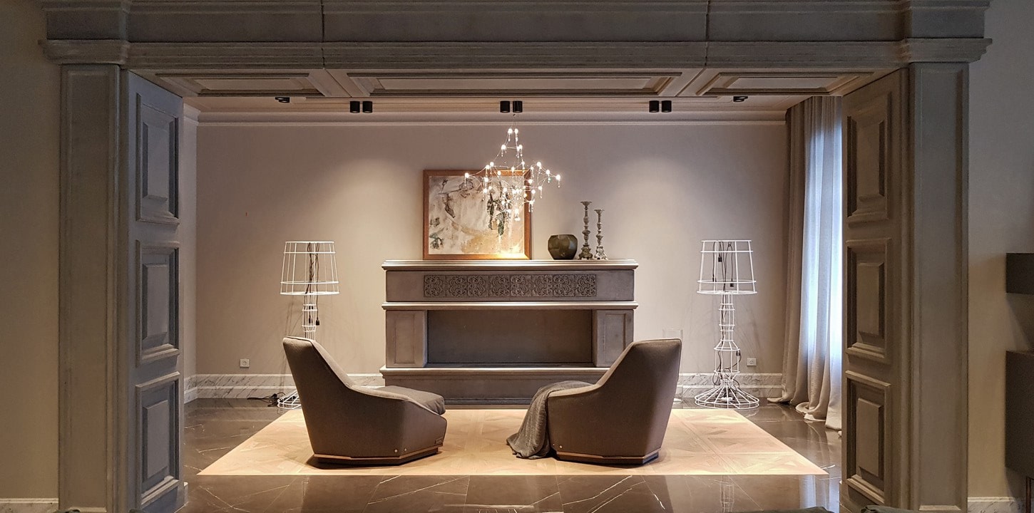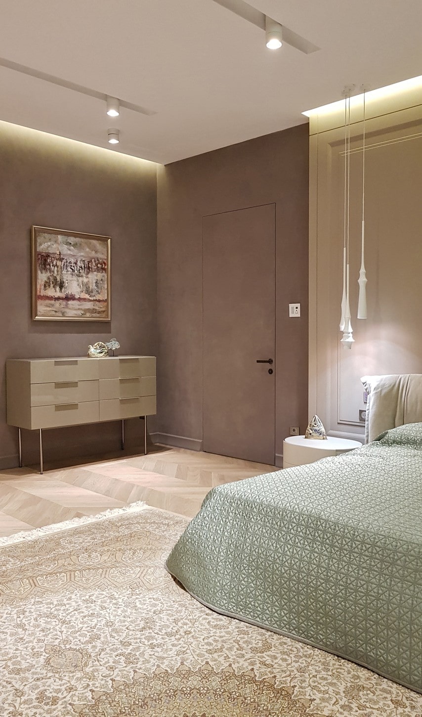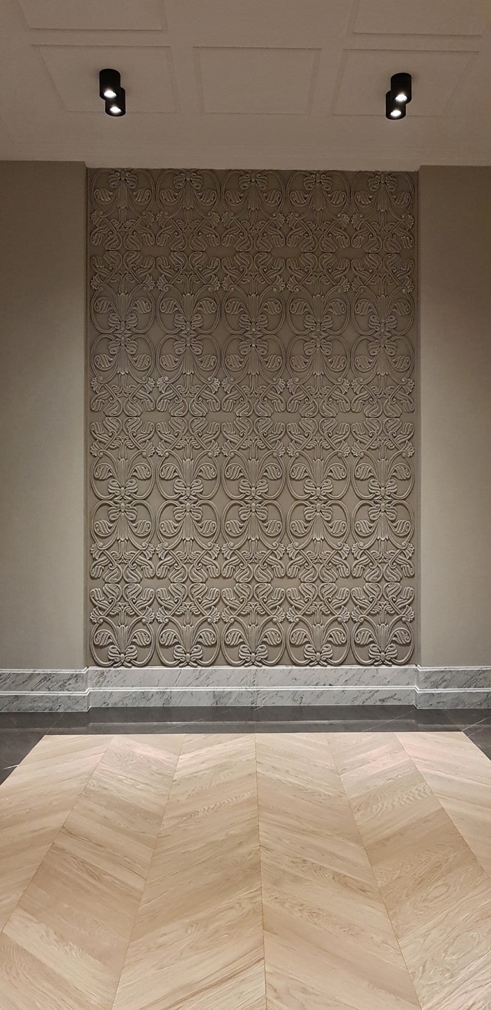 The concept of interior style mix. Powerful combination of: stone, wood, concrete, glass, gypsum & metal.