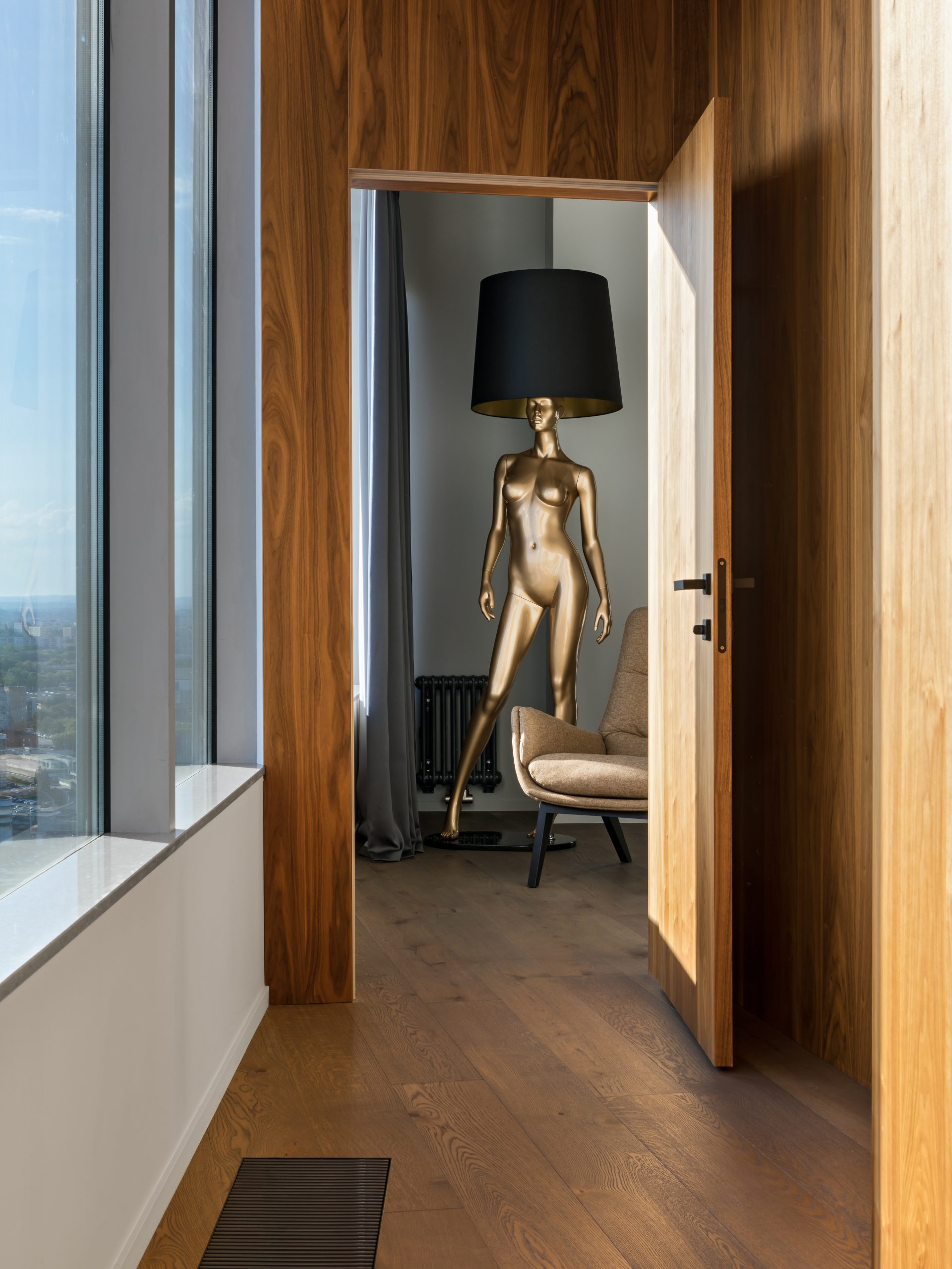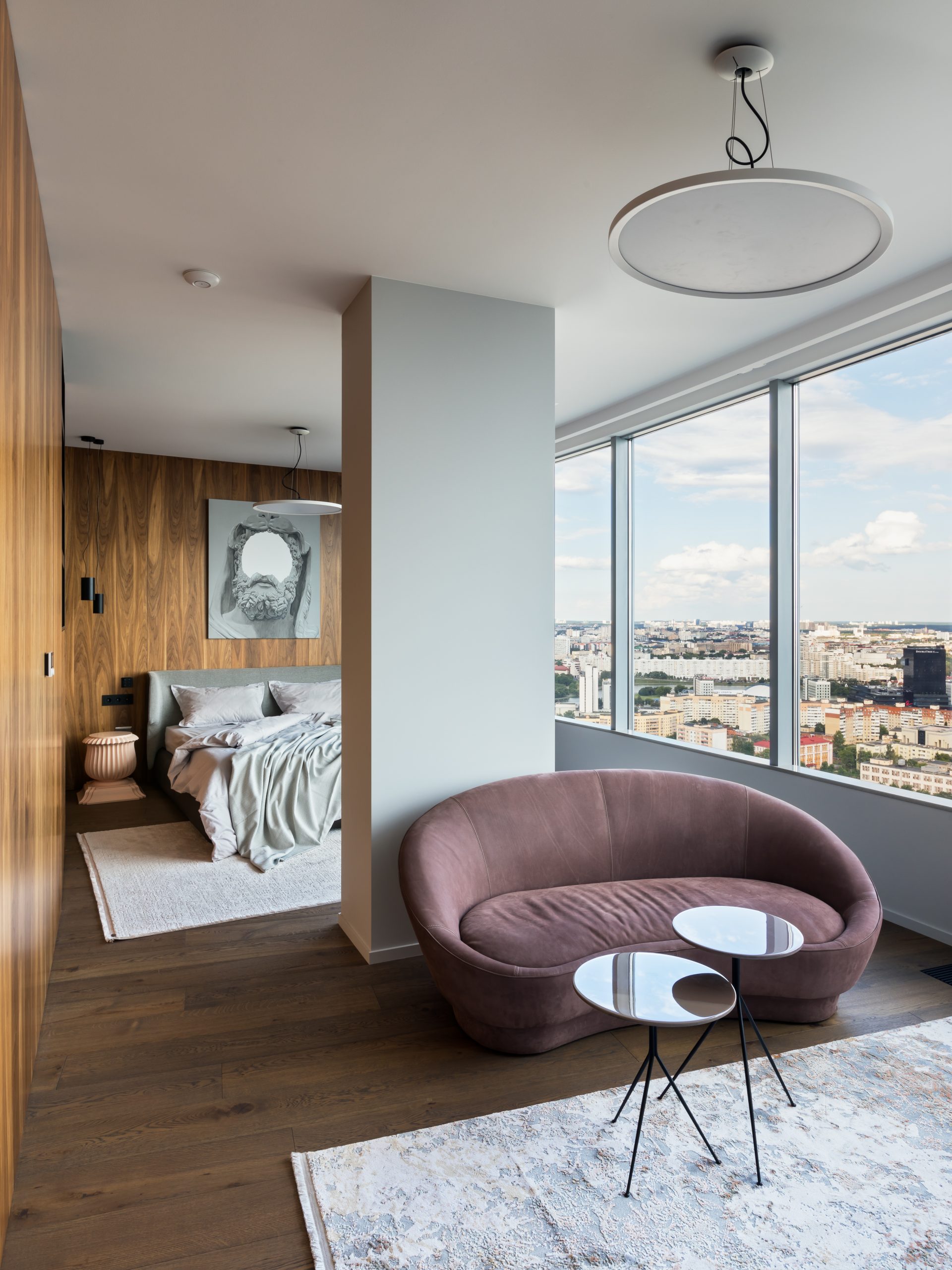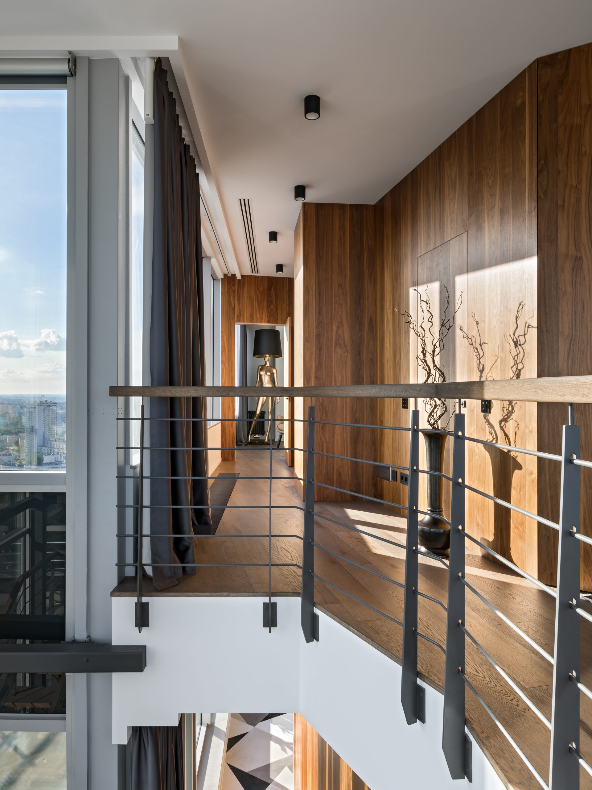Penthouse resides on floors 31 and 32 of apartment complex “Sail” and boasts an amazing window and terrace view. Basic space of 180 sqm had to be redesigned to create a light, spacious and comfortable for the whole family living area with some character in it. The key elements of design are veneered wood panels and furniture facades from natural Oak. Reserved furniture and decors are highlighted well against the wood background.