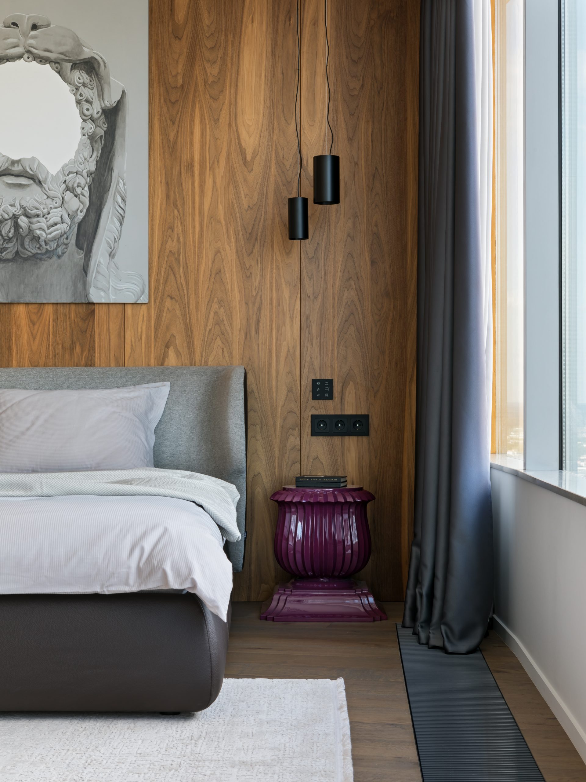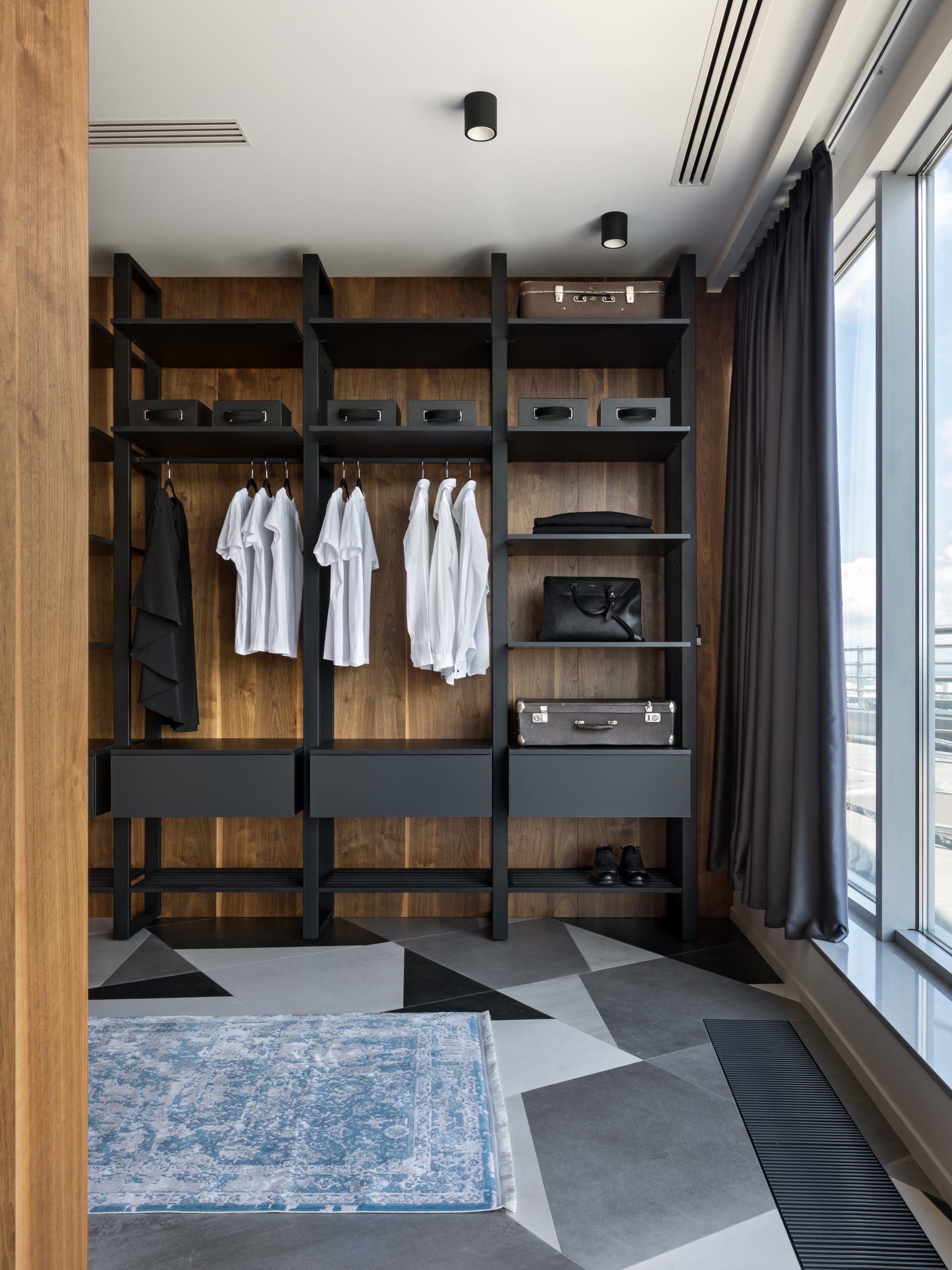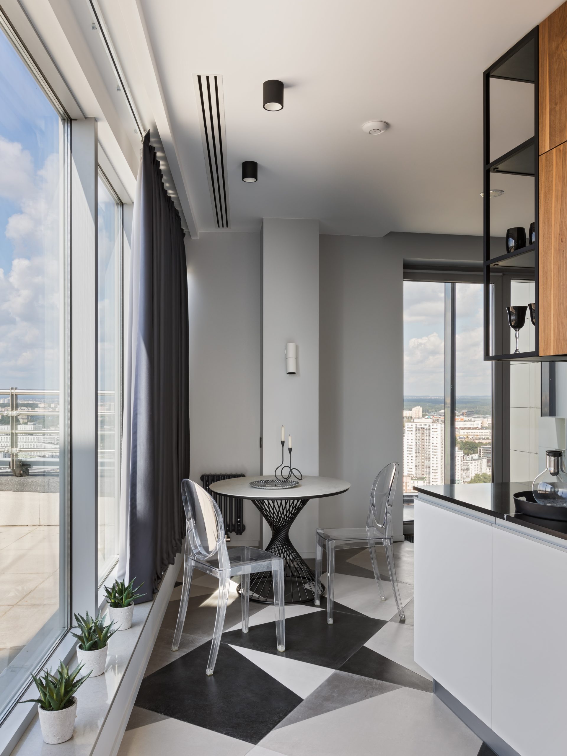 Penthouse resides on floors 31 and 32 of apartment complex “Sail” and boasts an amazing window and terrace view. Basic space of 180 sqm had to be redesigned to create a light, spacious and comfortable for the whole family living area with some character in it. The key elements of design are veneered wood panels and furniture facades from natural Oak. Reserved furniture and decors are highlighted well against the wood background.