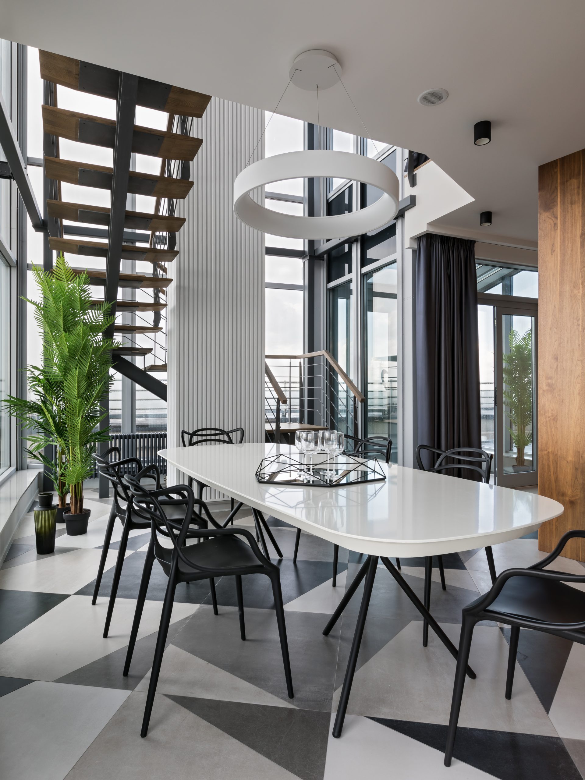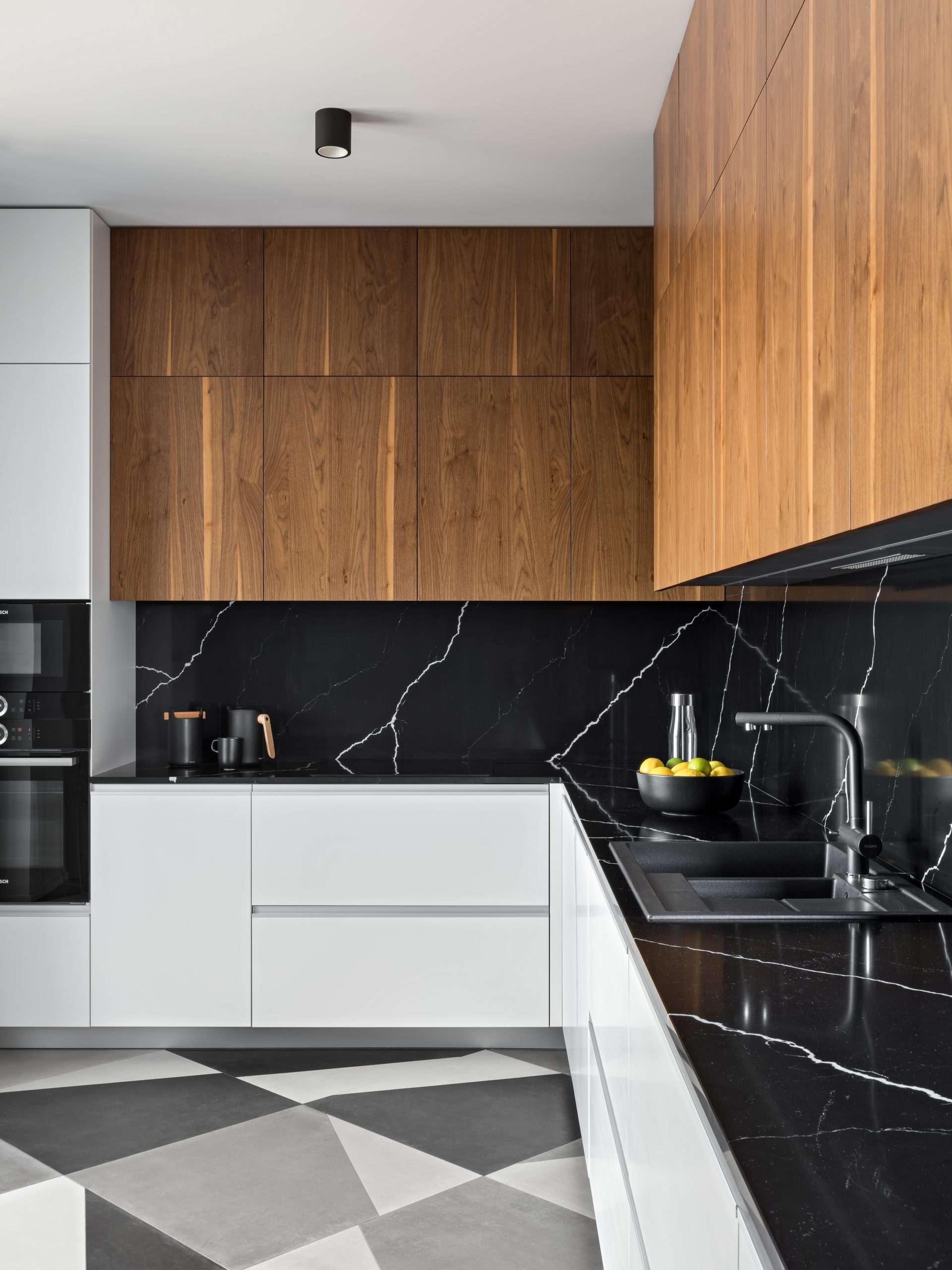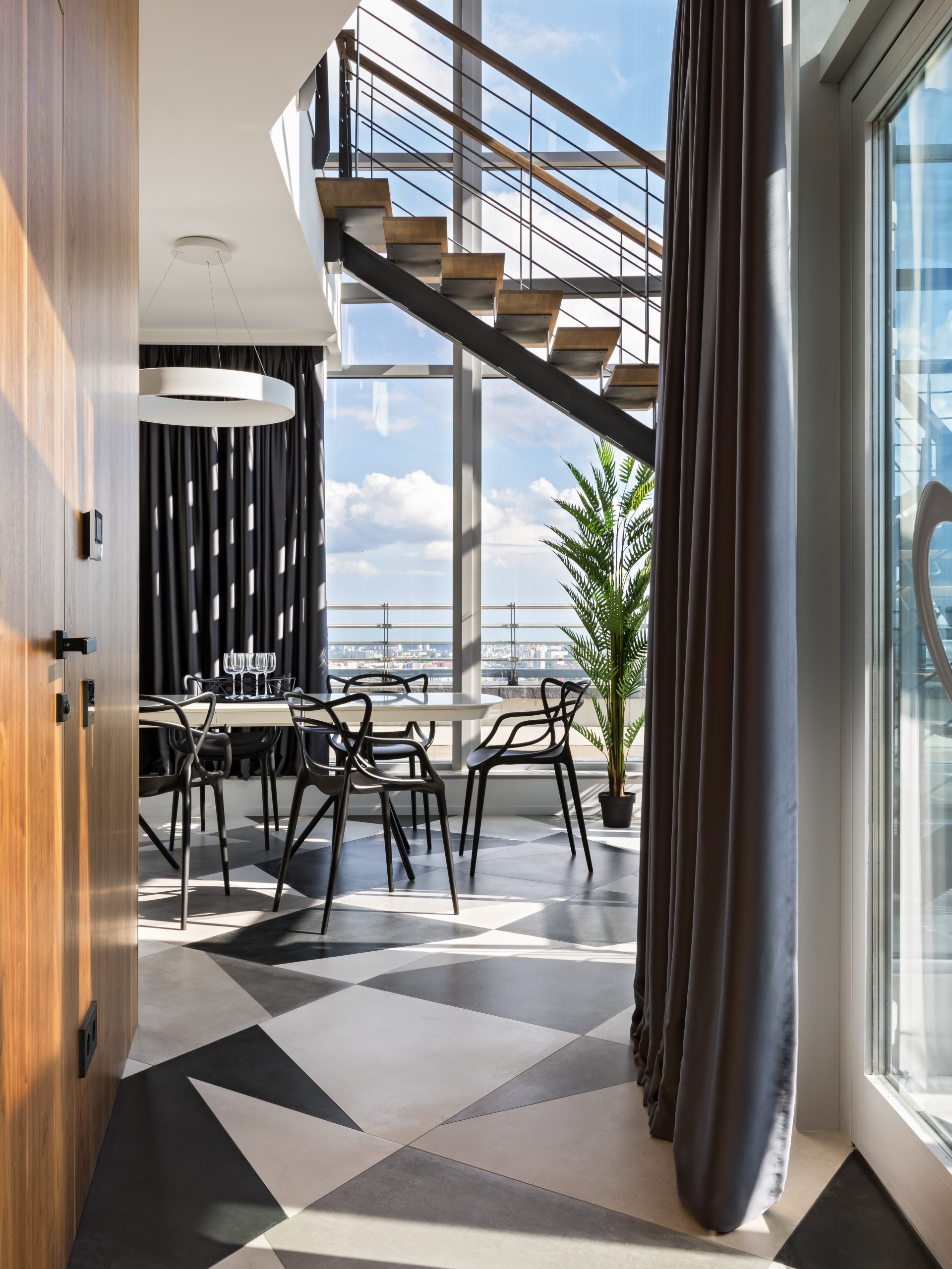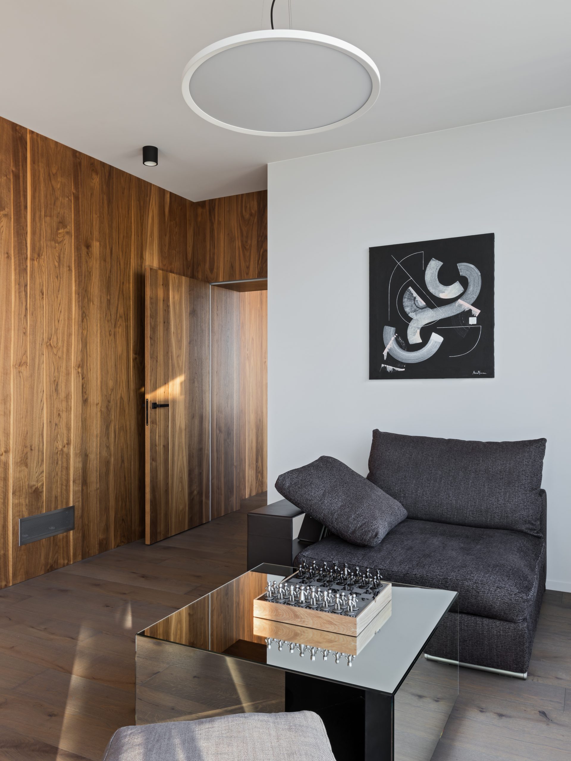 First level is decorated with beautiful pattern mosaic floor and rooms a spacious living room, kitchen with dining area and a large wardrobe. Private spaces of bedrooms, a playroom and a cabinet are sitting on the higher level. The ensemble of wooden floors, panels and facades makes the whole apartment look and feel comfortable and cozy.