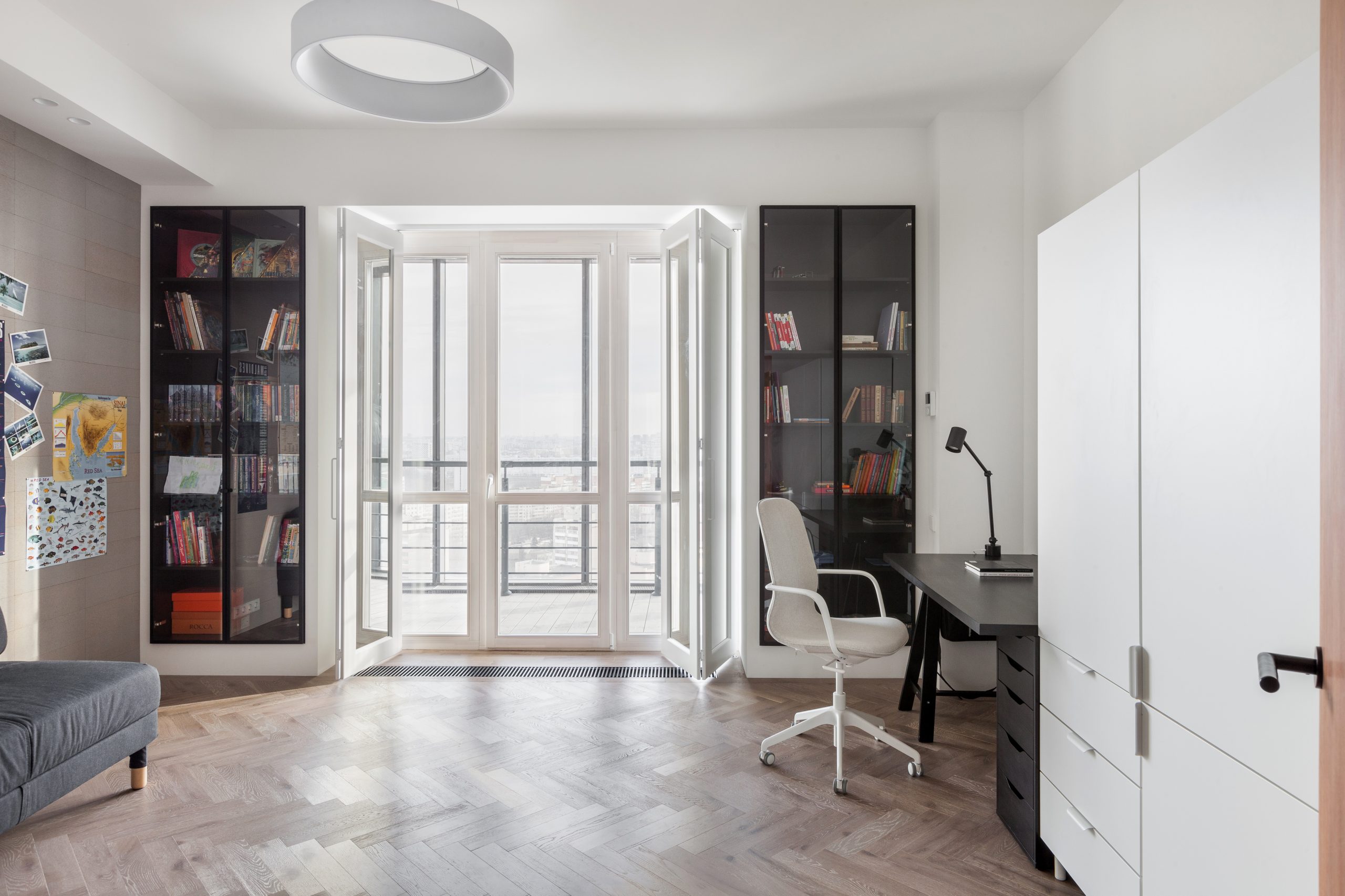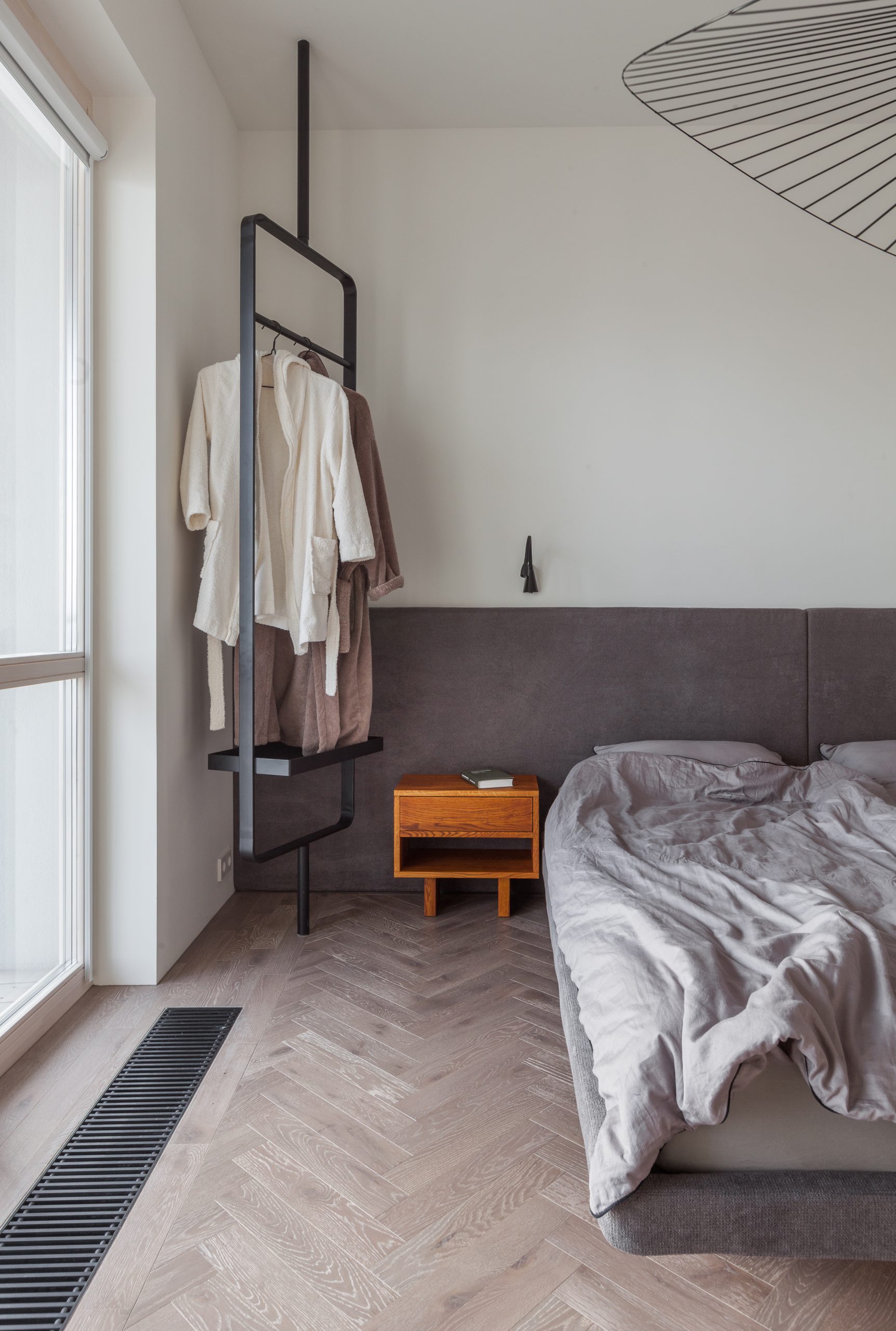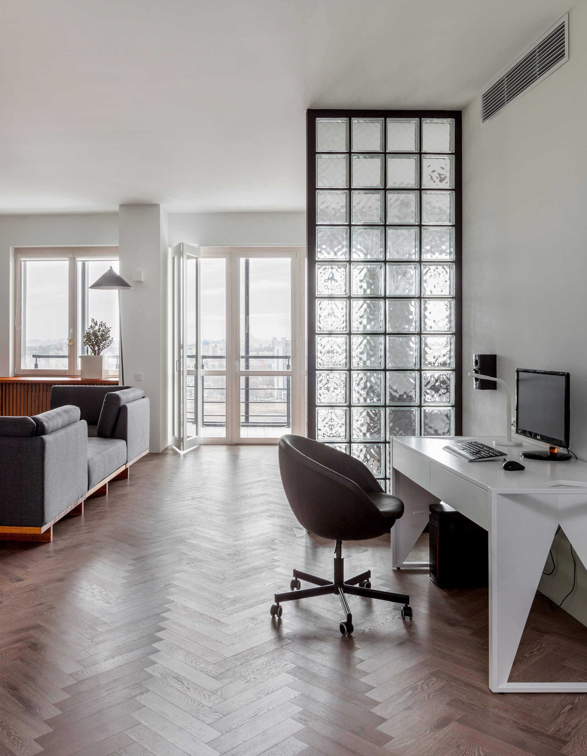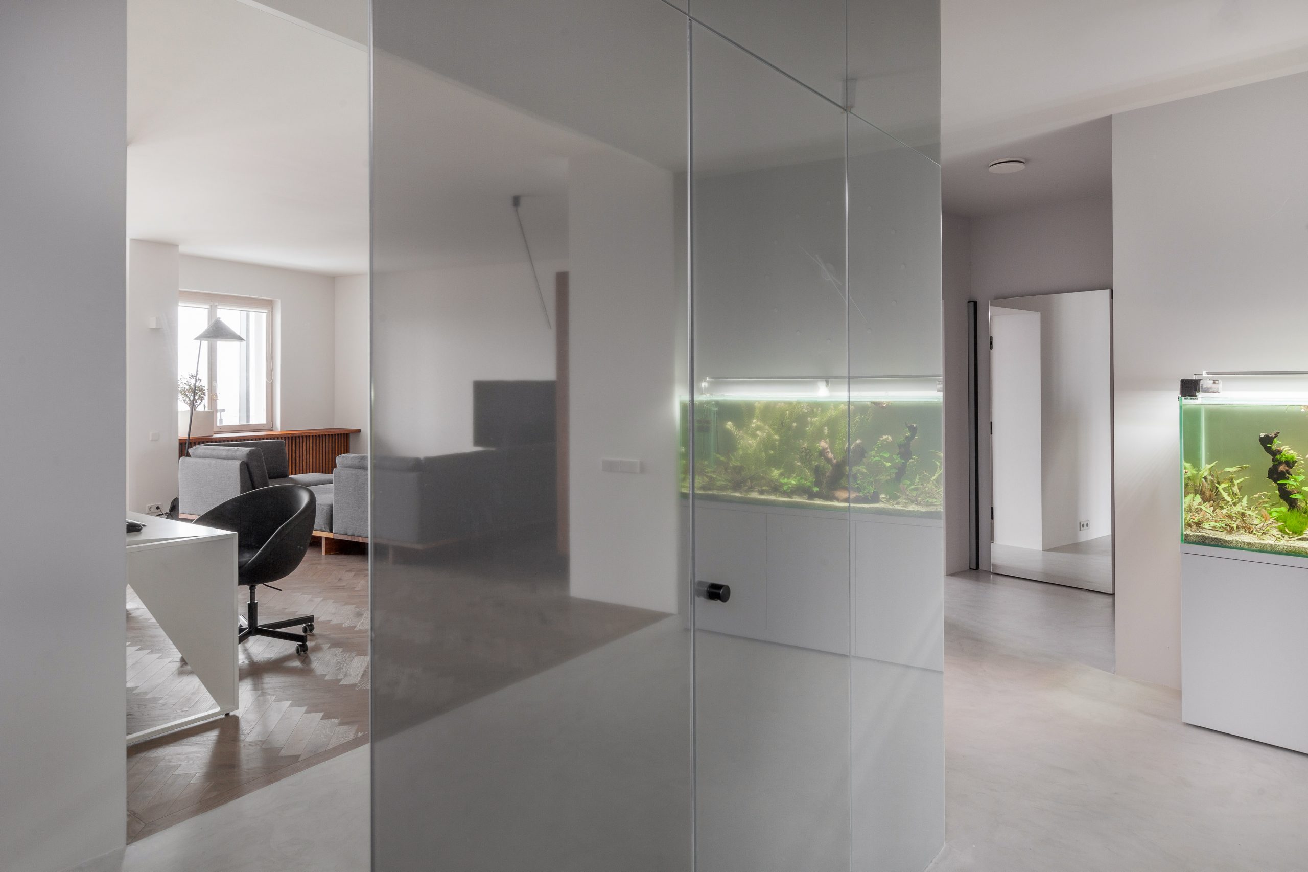 The monochrome range of the interior, which is dominated by white, grey and accented black, is brighten up with natural wood details. Calm minimalistic wall decoration helps to focus on furniture created speciаlly for this project. The unity of the furniture decoration gives a sense of space integrity. And a classic oak flooring in a soft velvety color “Cashmere Gray” adds coziness.