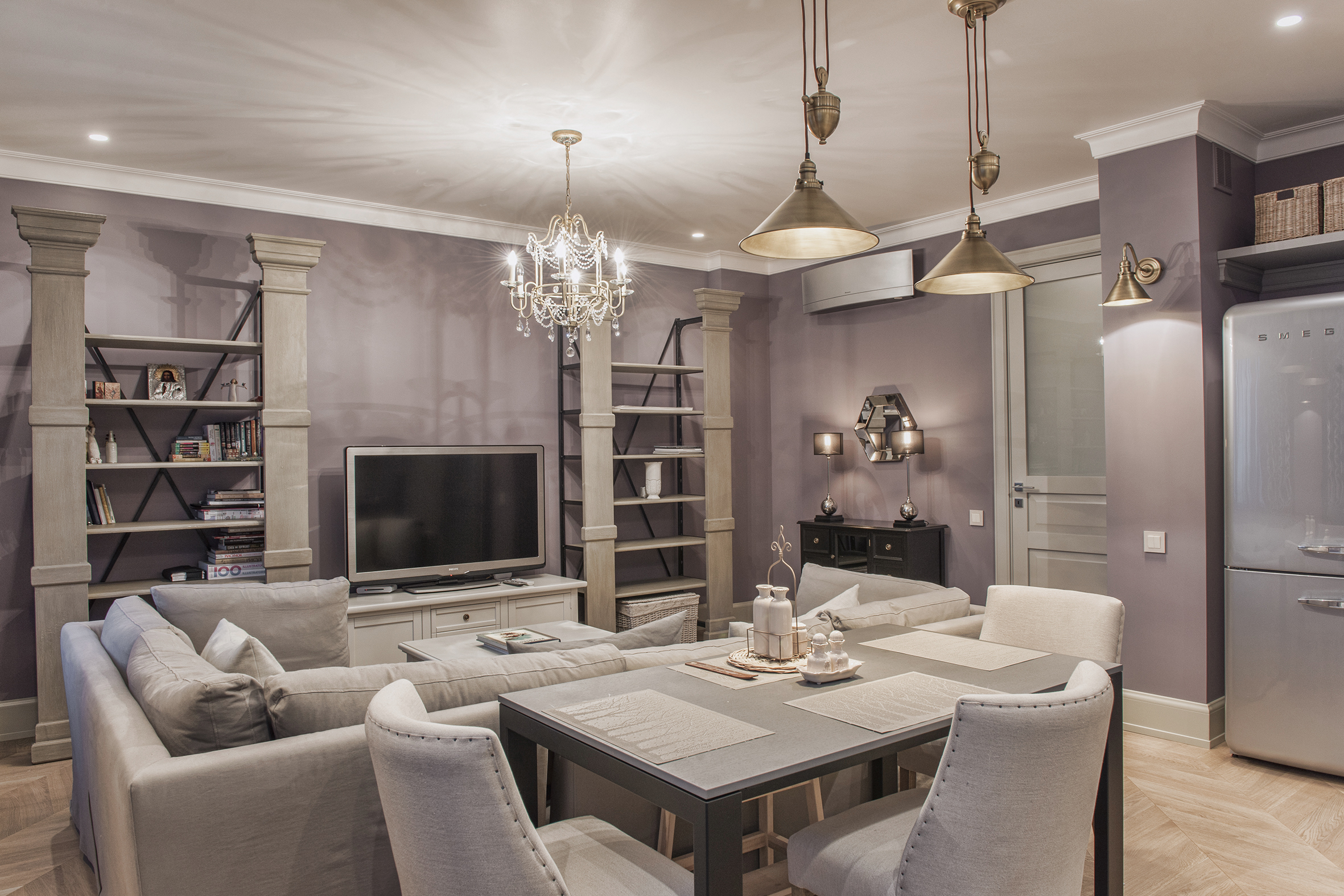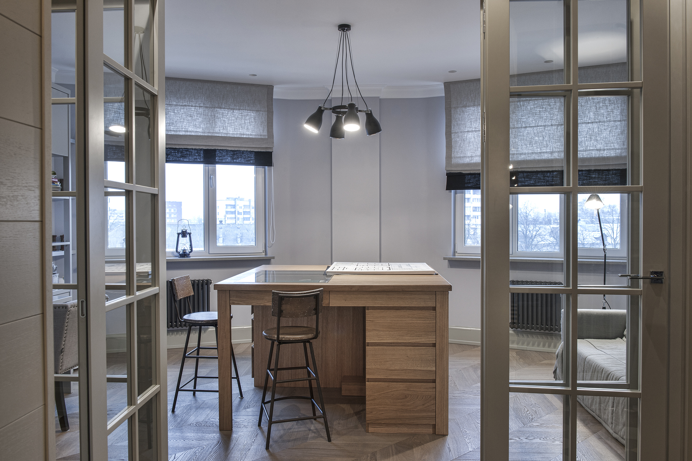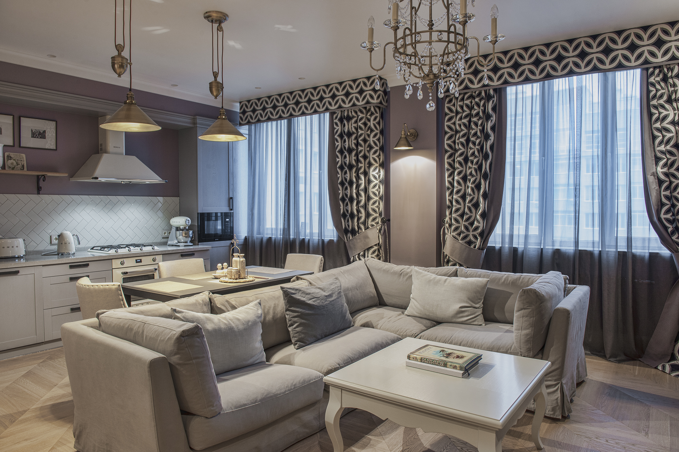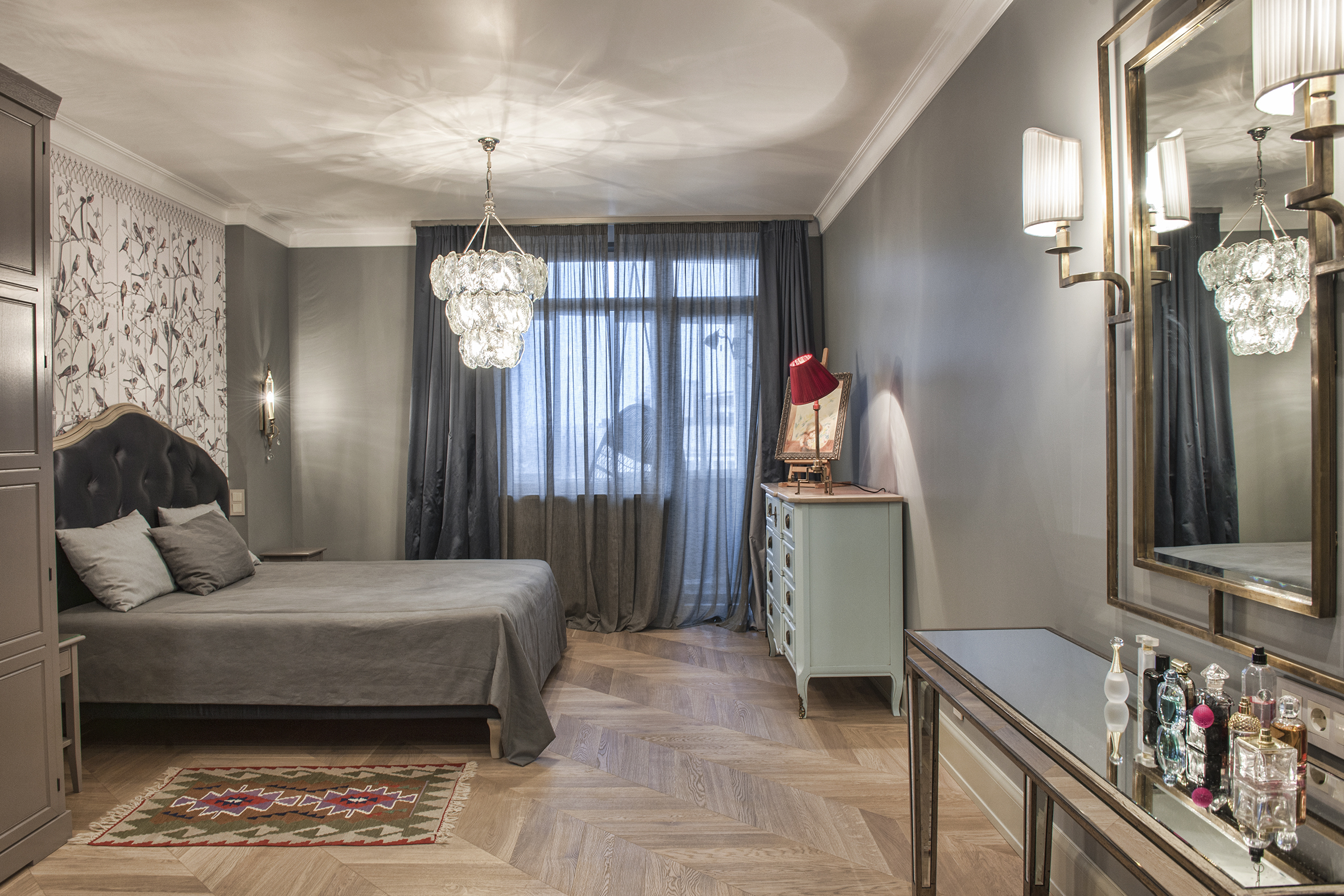 Irina always finds extraordinary solutions, masterfully combining different in style objects and is not afraid to experiment with color. As in this enveloping monochrome and at the same time multi-faceted interior that reveals the depth and richness of shades and halftones of noble gray. The accent curtains frame the space like a rich frame – a pattern in pastel tones. The combination of modern classics and Art Deco elements in furniture and decor creates a voluminous, multilayered, expressive interior. And the warm shade of natural oak parquet serves as a soft natural background for it.
