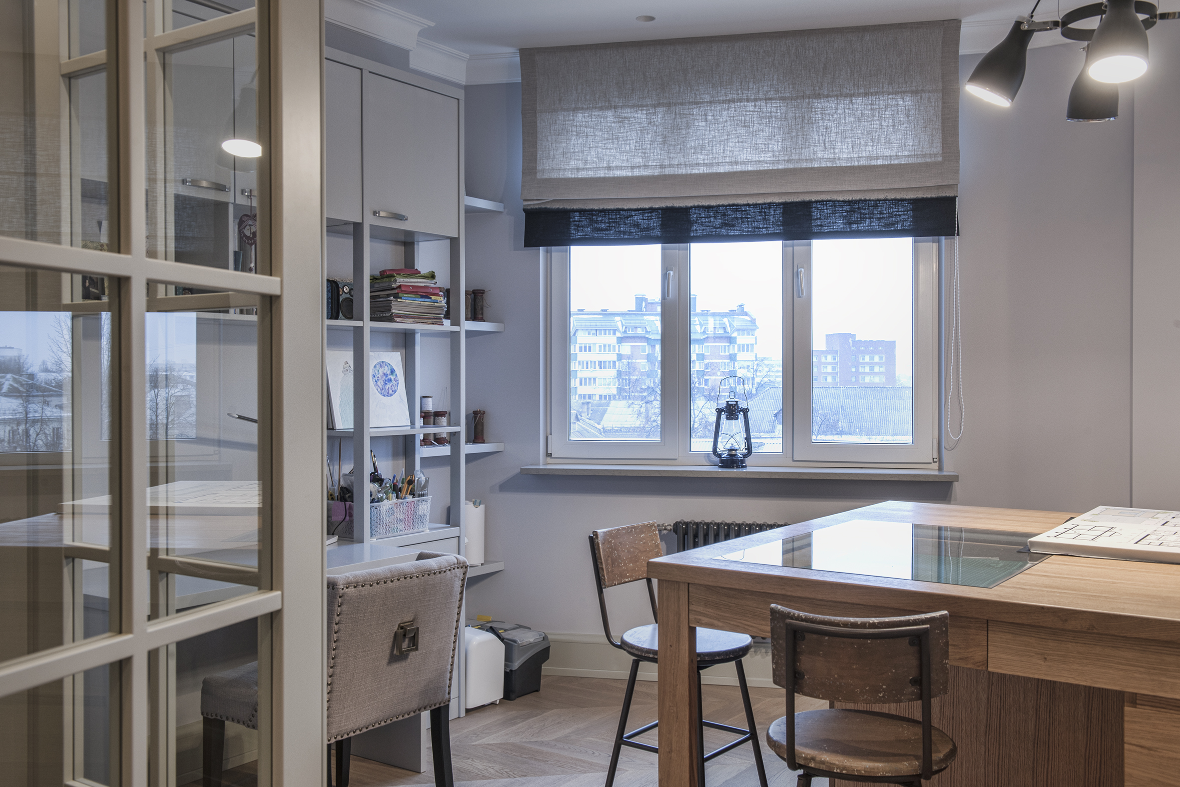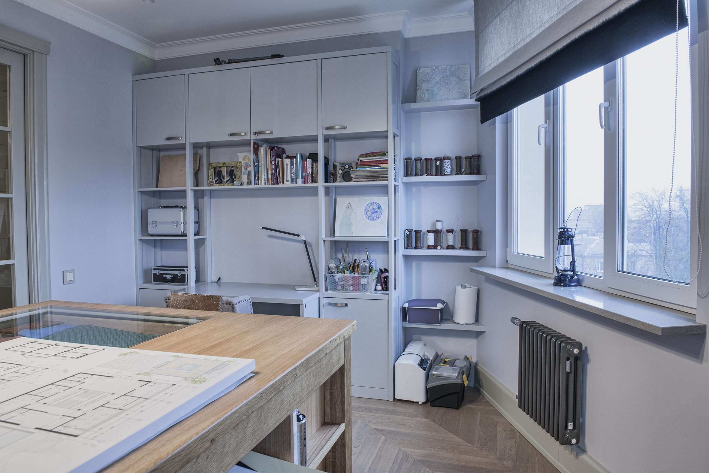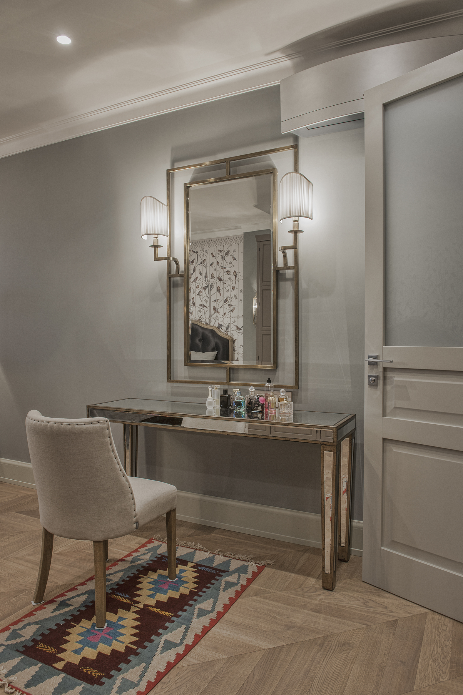Irina always finds extraordinary solutions, masterfully combining different in style objects and is not afraid to experiment with color. As in this enveloping monochrome and at the same time multi-faceted interior that reveals the depth and richness of shades and halftones of noble gray. The accent curtains frame the space like a rich frame – a pattern in pastel tones. The combination of modern classics and Art Deco elements in furniture and decor creates a voluminous, multilayered, expressive interior. And the warm shade of natural oak parquet serves as a soft natural background for it.