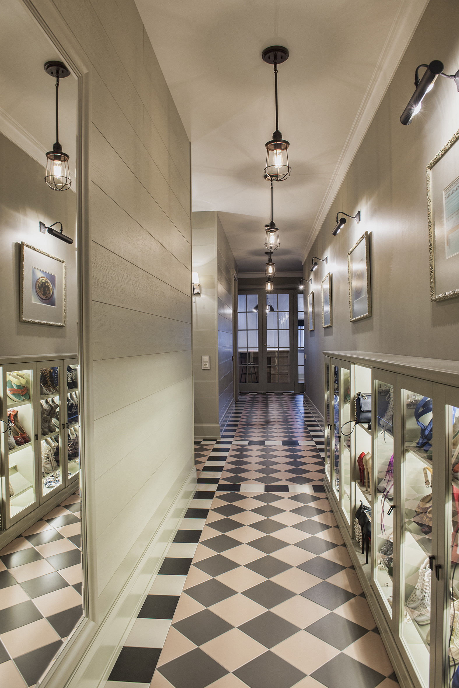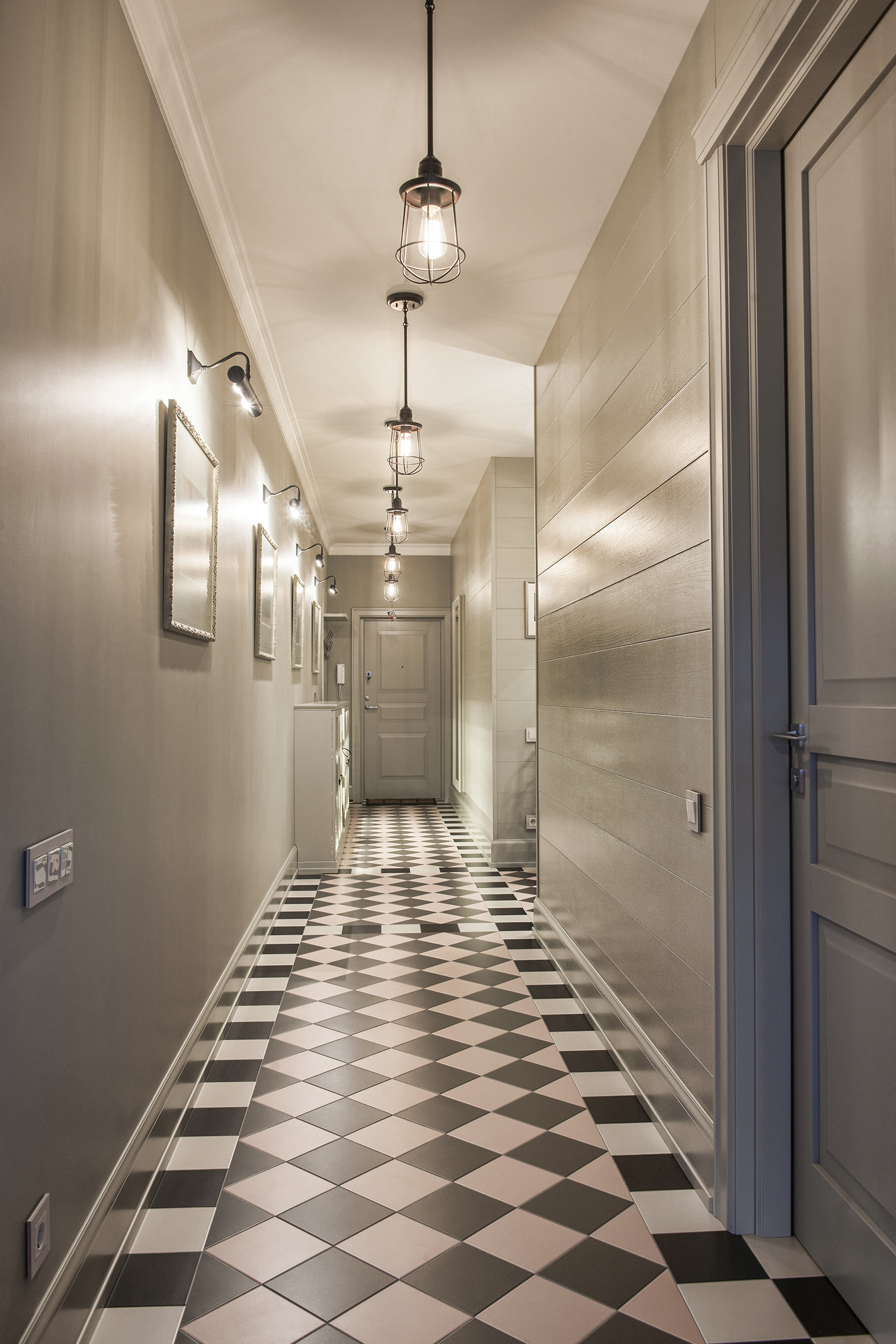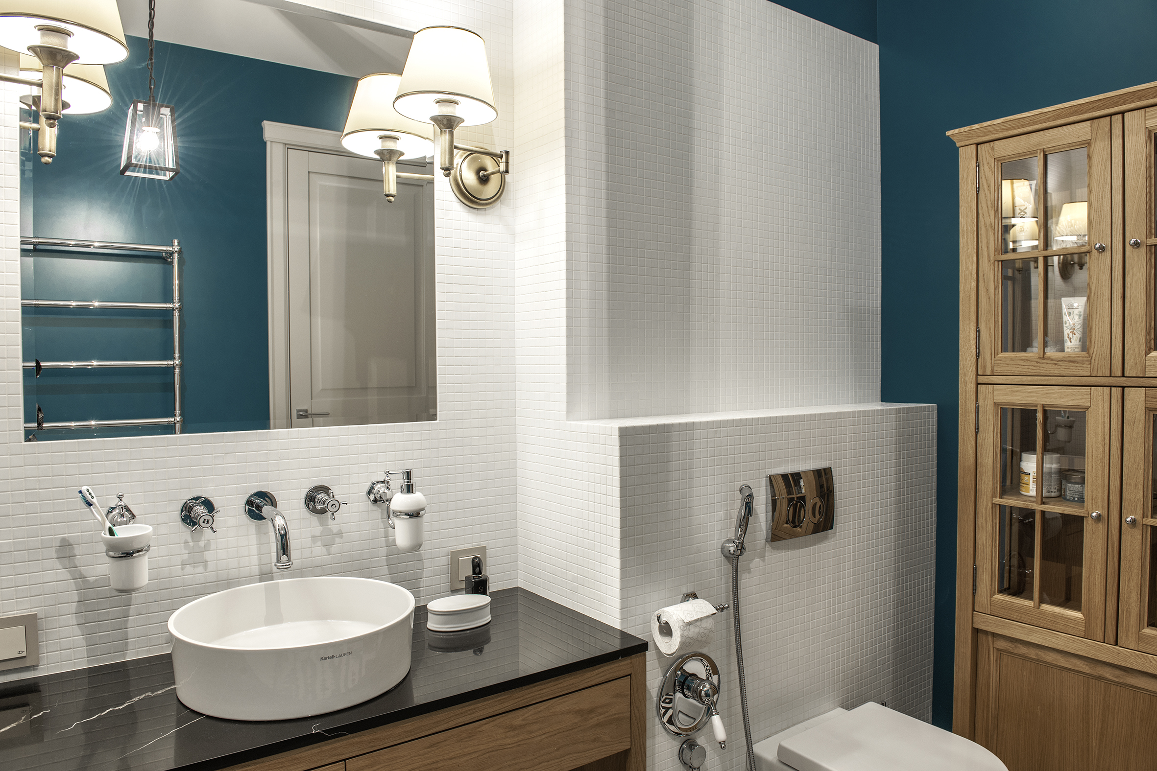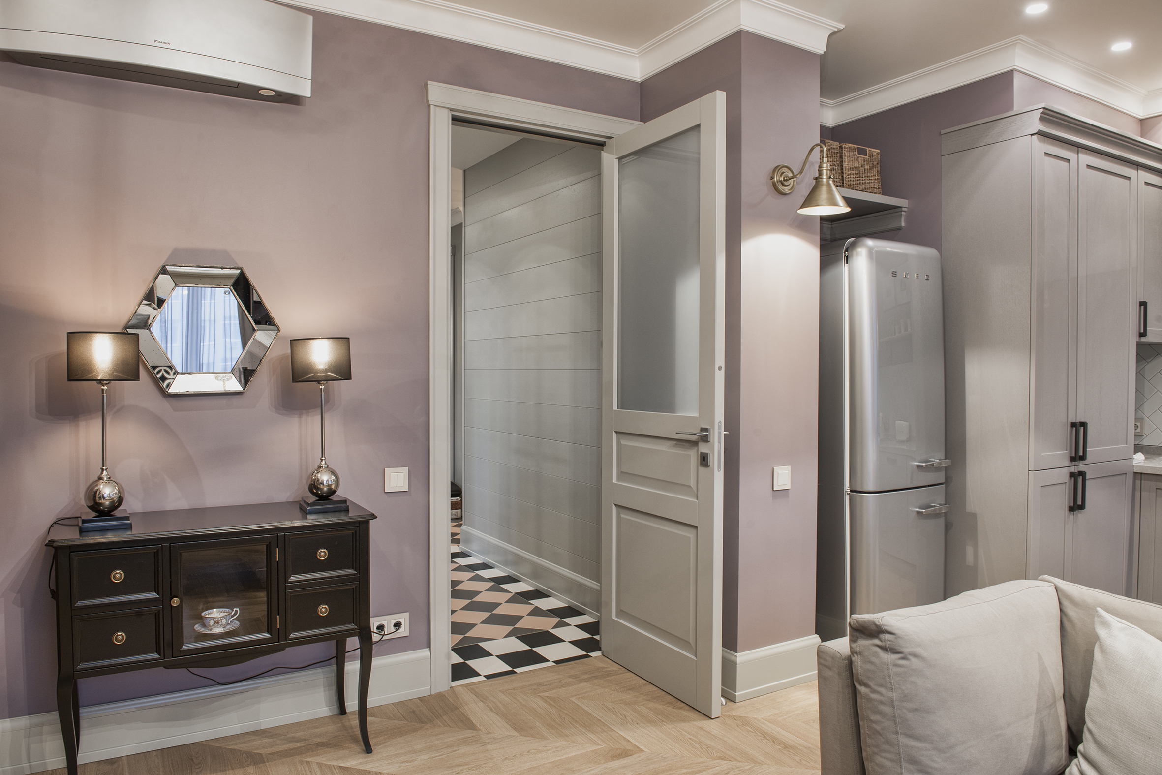 Irina always finds extraordinary solutions, masterfully combining different in style objects and is not afraid to experiment with color. As in this enveloping monochrome and at the same time multi-faceted interior that reveals the depth and richness of shades and halftones of noble gray. The accent curtains frame the space like a rich frame – a pattern in pastel tones. The combination of modern classics and Art Deco elements in furniture and decor creates a voluminous, multilayered, expressive interior. And the warm shade of natural oak parquet serves as a soft natural background for it.