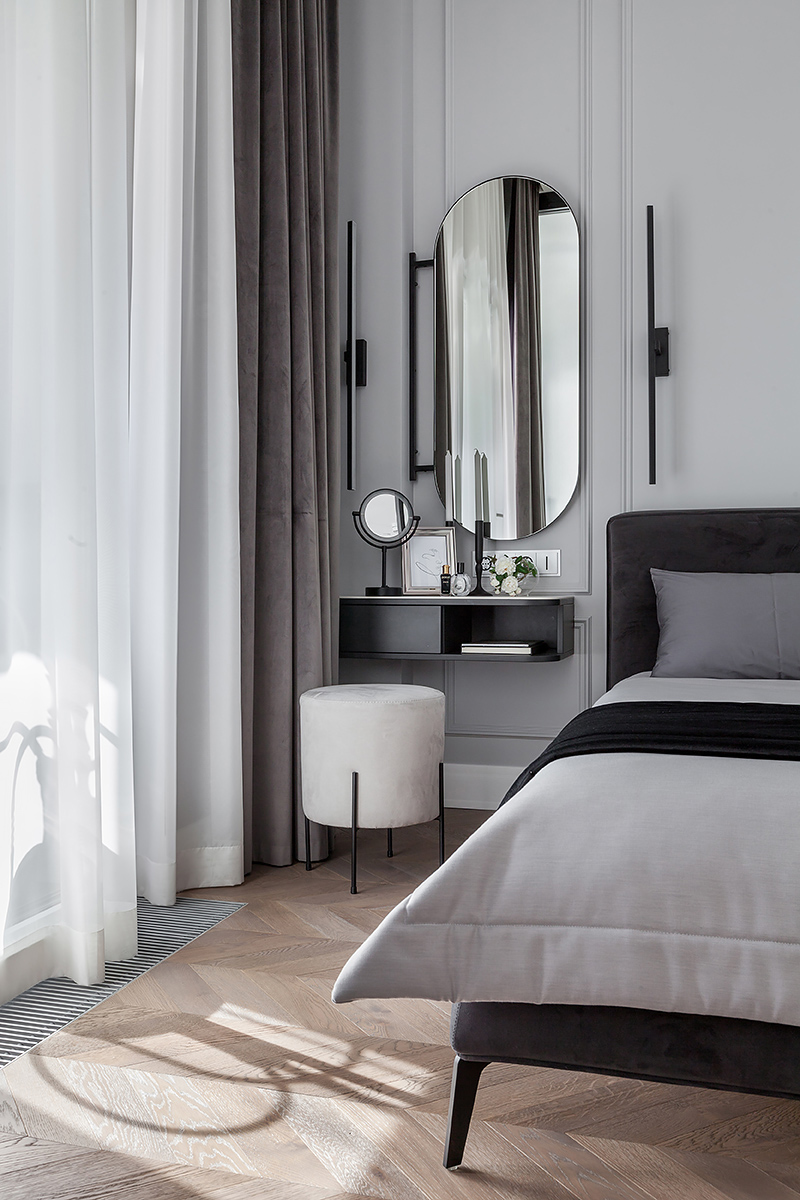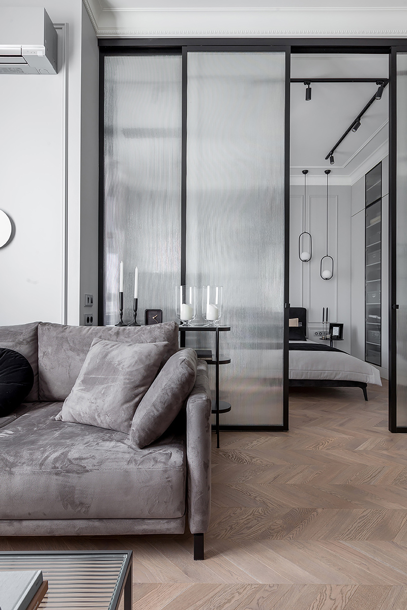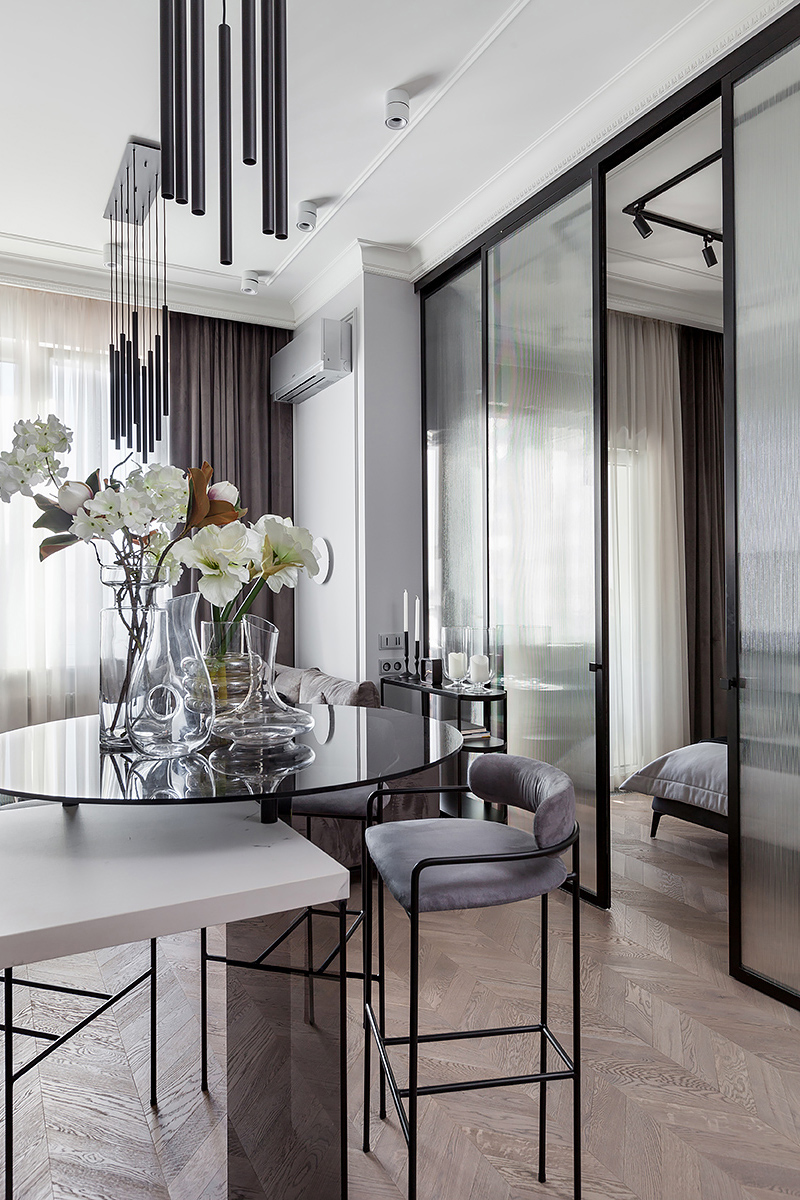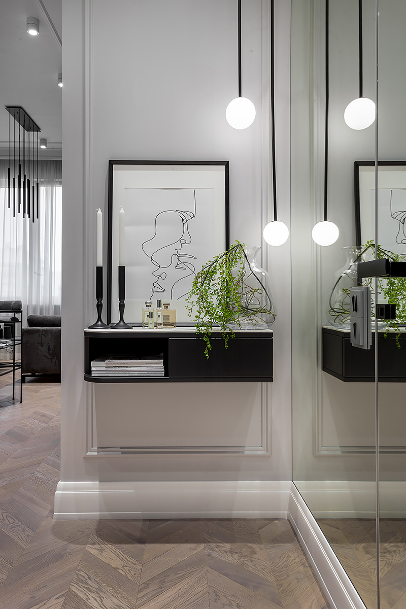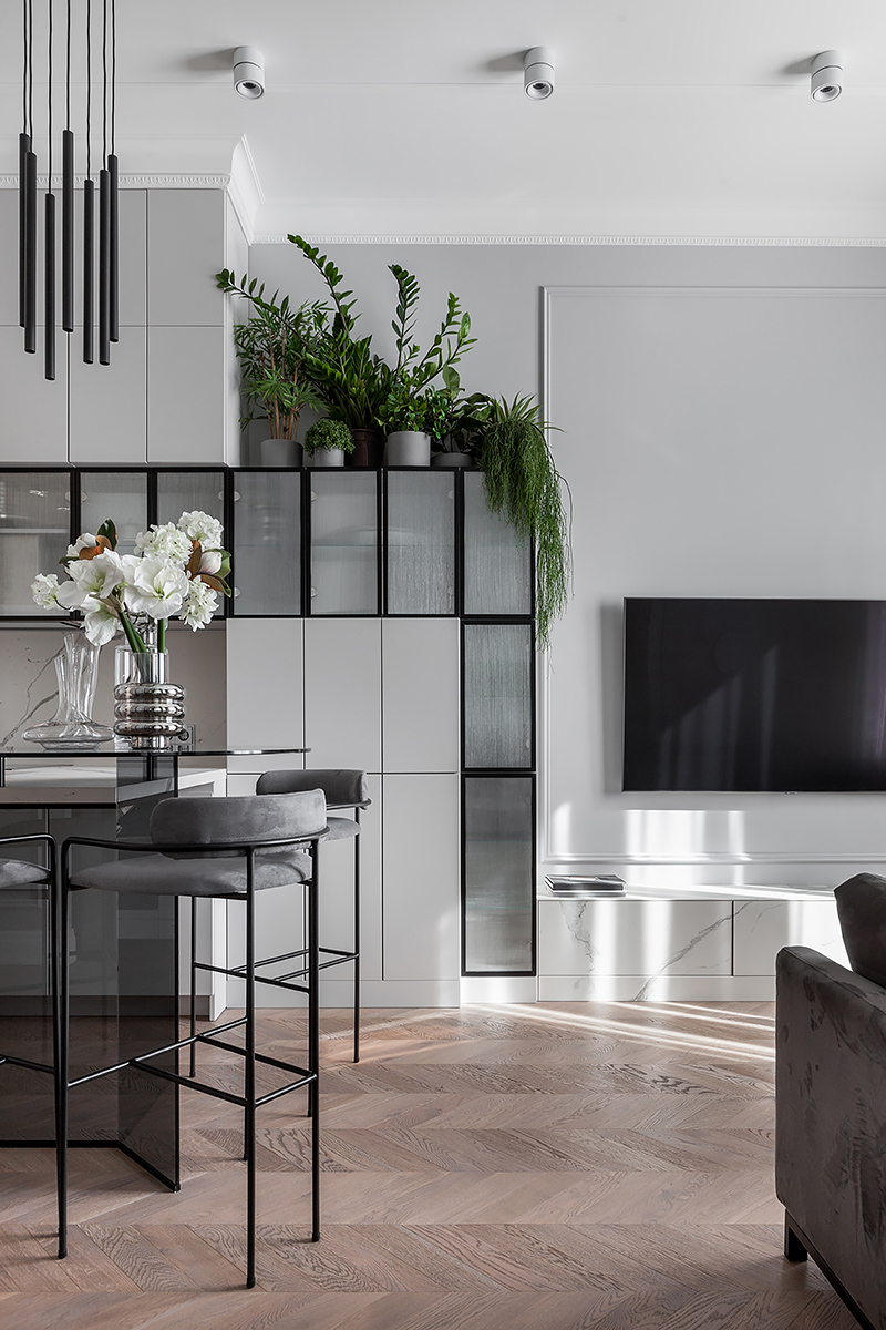 Chevron flooring, stucco on the walls, minimalist furniture, the interior design combines elegancy with ergonomics and technology. The space is subdued, nothing superfluous, just like Total Black. Except for grey was used in the stead of black. Monochrome grey tones with white and black are balanced out by the natural wood on the floor and the green of the house plants. Lots of glass and mirrors gives the space light and makes it appear larger.