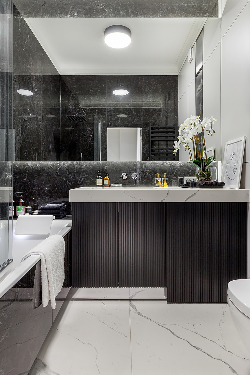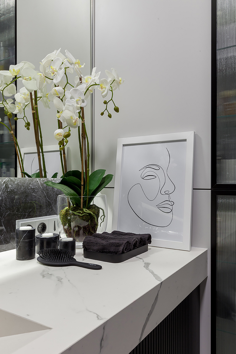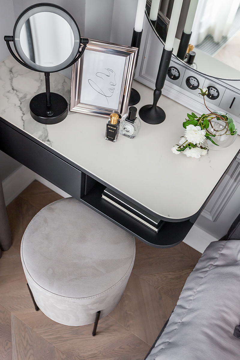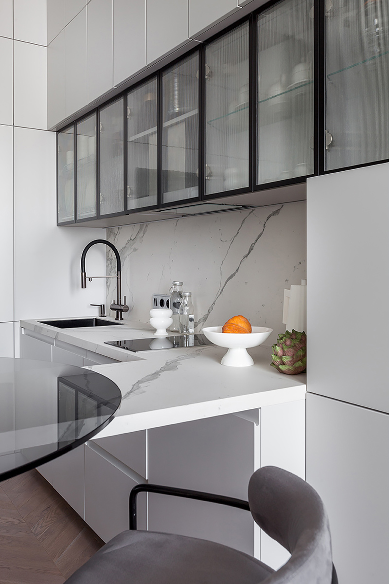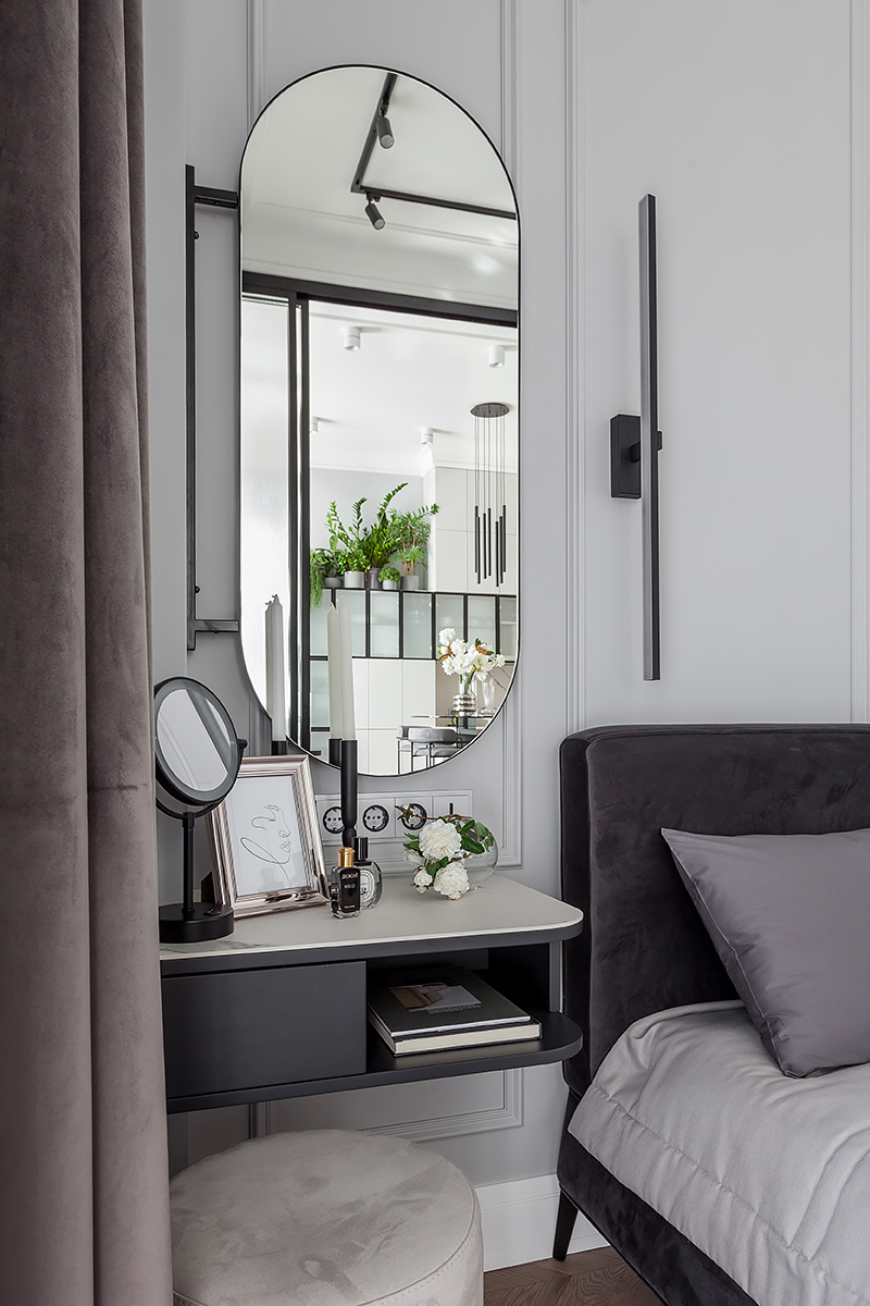 Chevron flooring, stucco on the walls, minimalist furniture, the interior design combines elegancy with ergonomics and technology. The space is subdued, nothing superfluous, just like Total Black. Except for grey was used in the stead of black. Monochrome grey tones with white and black are balanced out by the natural wood on the floor and the green of the house plants. Lots of glass and mirrors gives the space light and makes it appear larger.